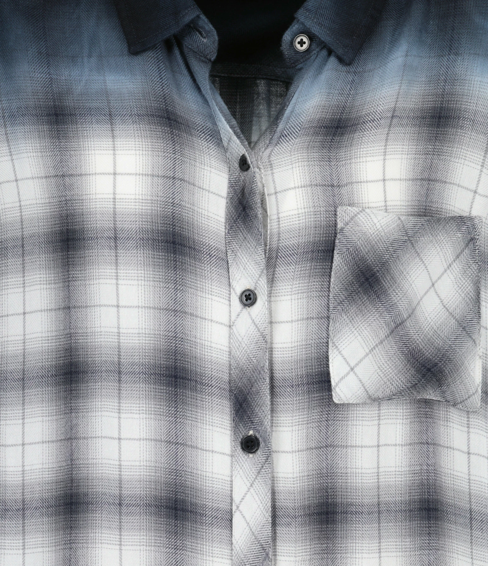 Chemise à carreaux et effet tie and dye bleu. Col chemise. Manches longues. Fermeture boutonnée. Une poche plaquée poitrine. Coupe droite. Base arrondie.