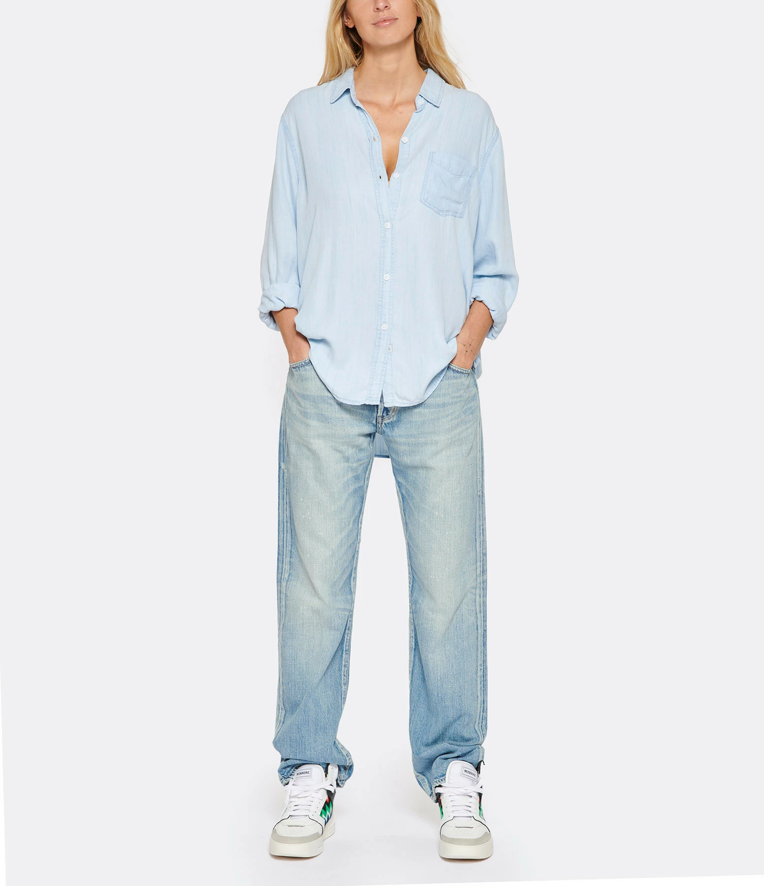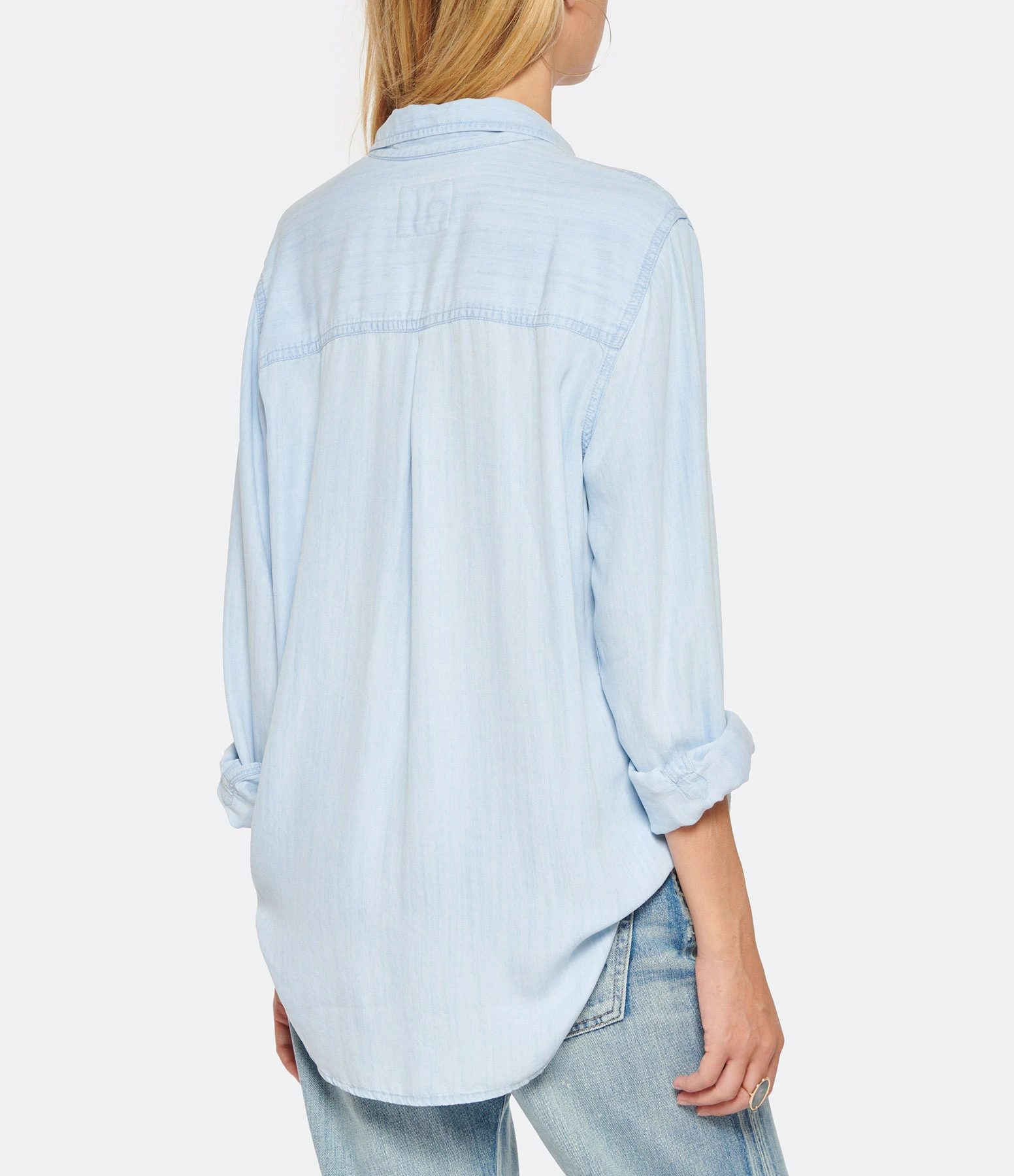 Chemise en denim de lyocell bleu clair. Col chemisier. Manches longues avec fentes et poignets boutonnés. Fermeture boutonnée. Petits boutons blancs nacrés. Une poche plaquée poitrine. Pli milieu dos. Coupe droite. Base arrondie