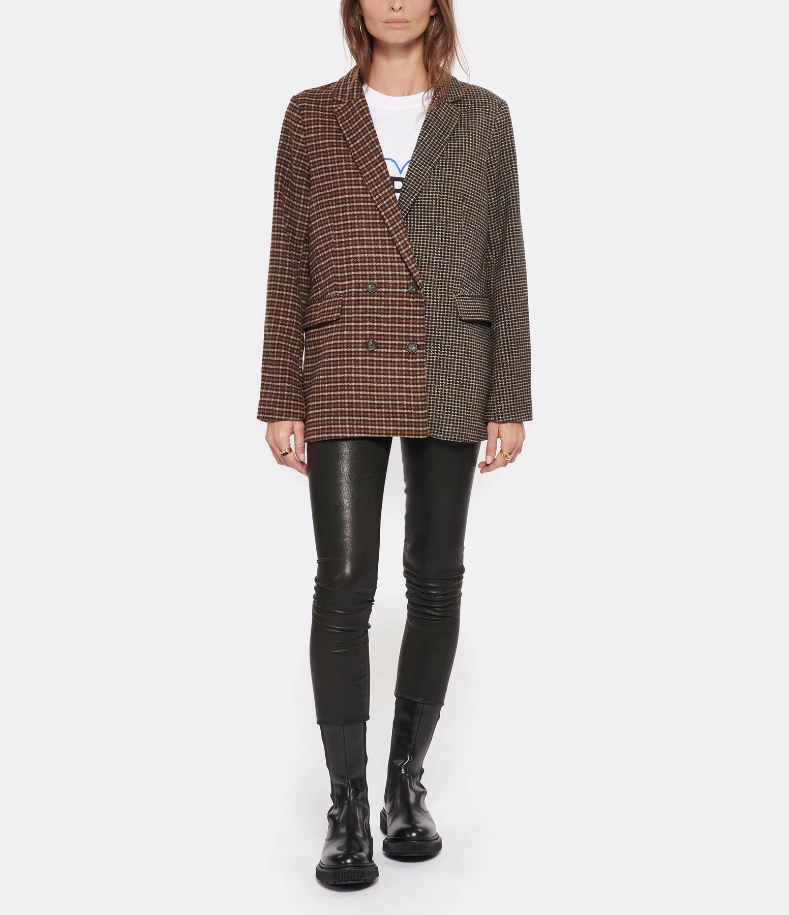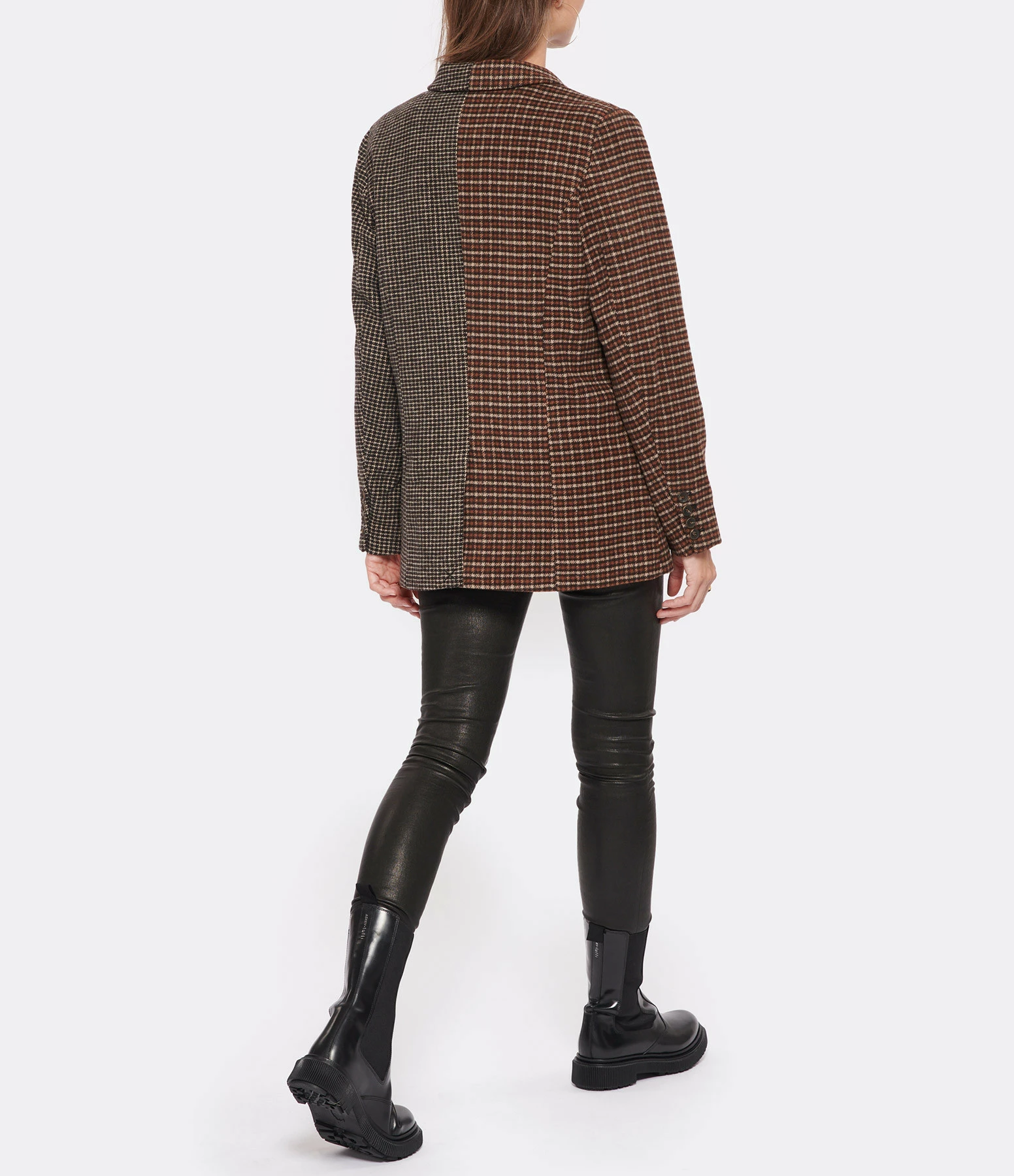 Blazer en laine mélangée à carreaux noir et marron. Col tailleur cranté. Manches longues tailleur. Fermeture boutonnée sur le devant. Boutons aspect corne noirs. Deux poches à rabat sur le devant. Coupe droite. Base droite. Entièrement doublé.