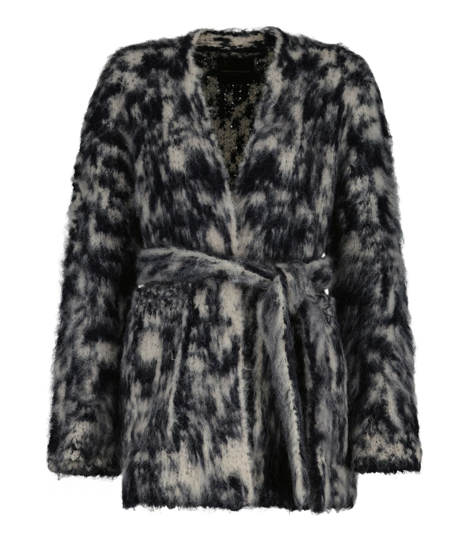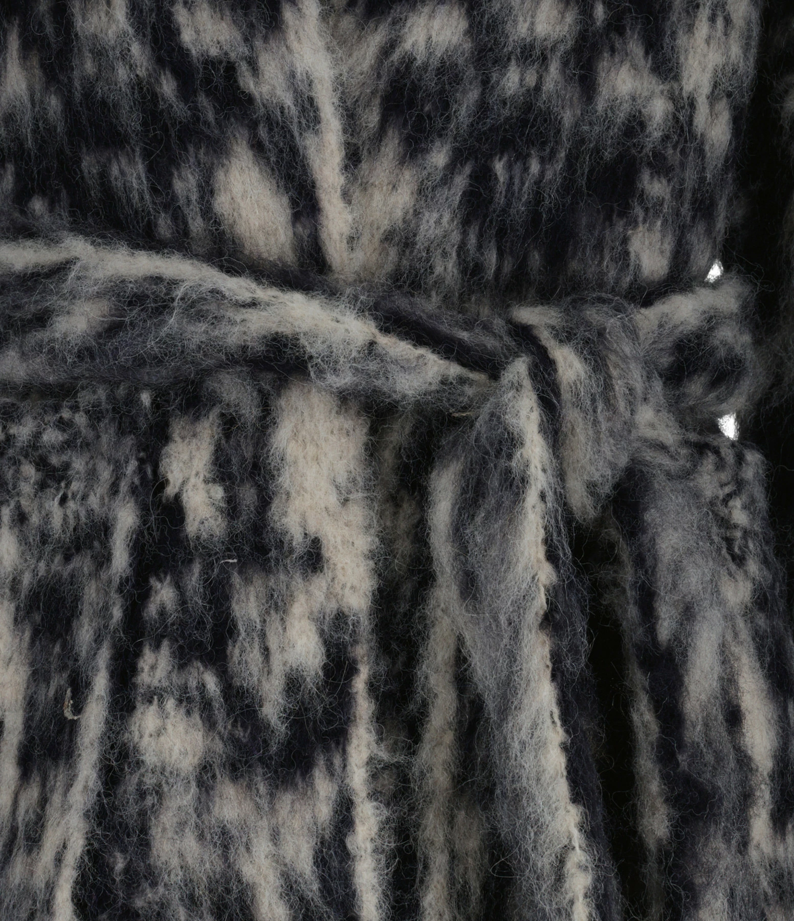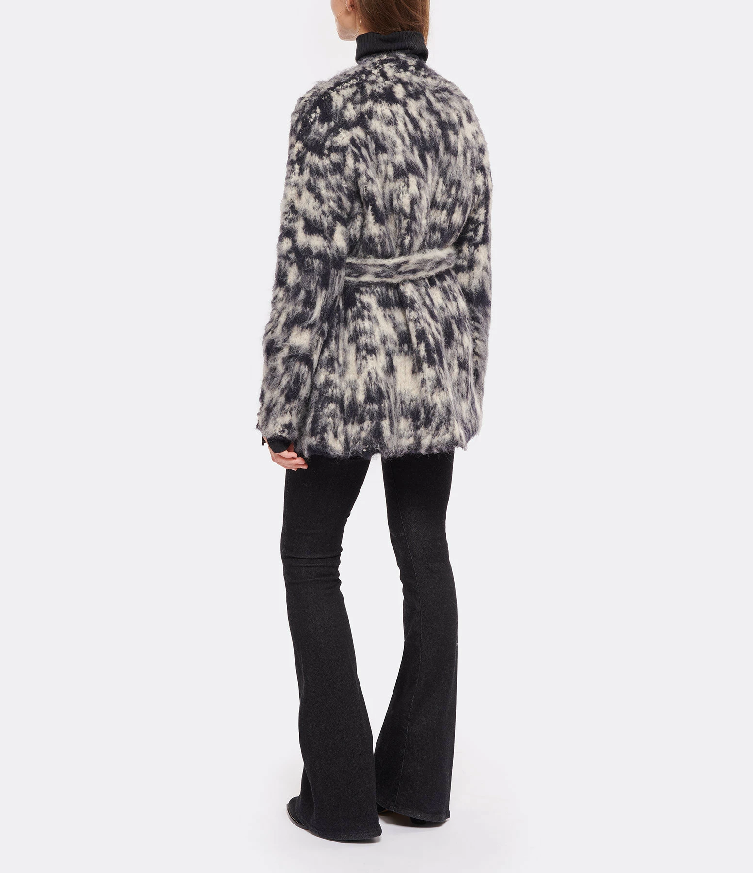 Cardigan ceinturé en laine imprimé bleu marine et beige. Deux poches plaquées à l’avant. Manches longues. Coupe ample. Base droite.