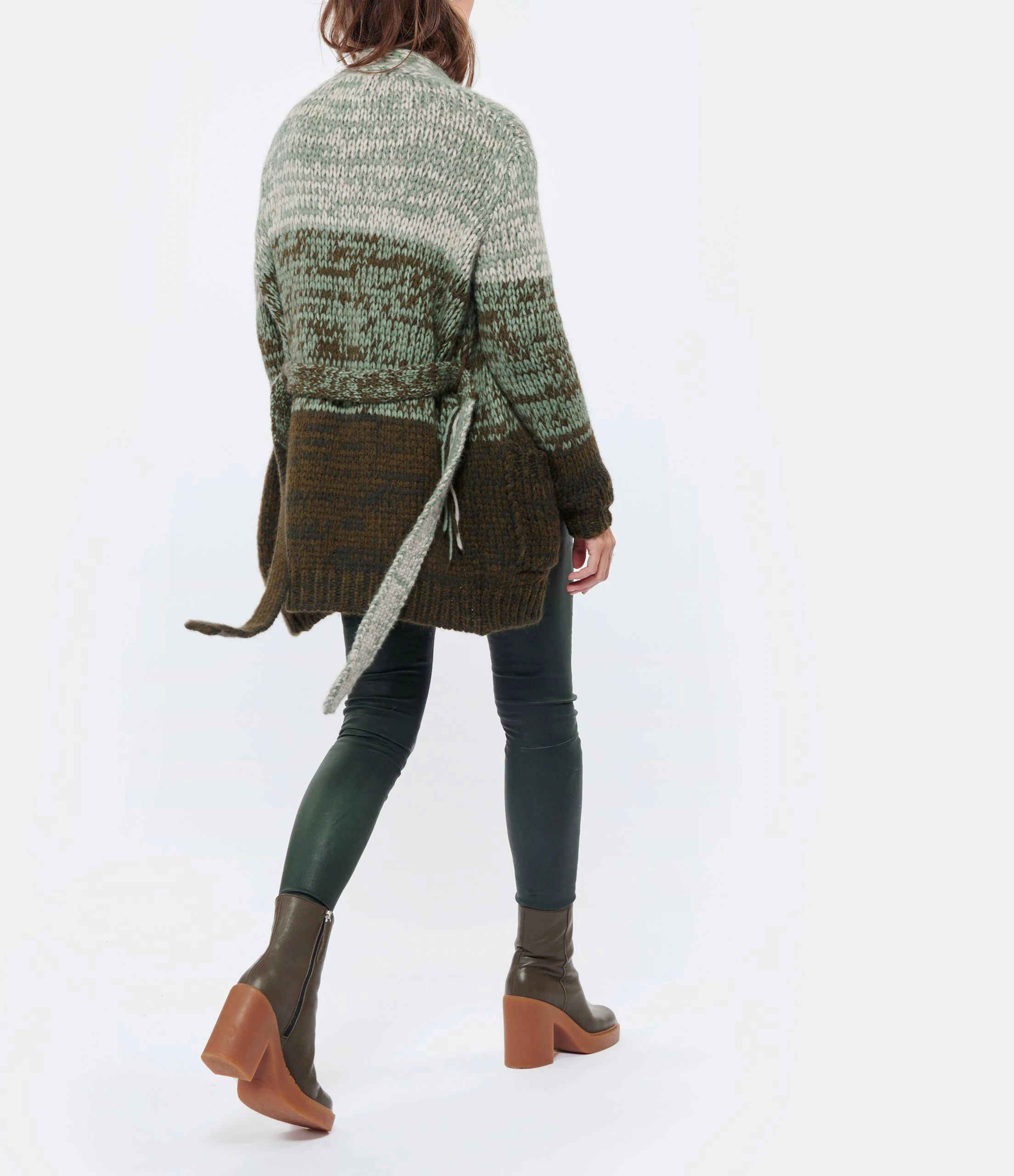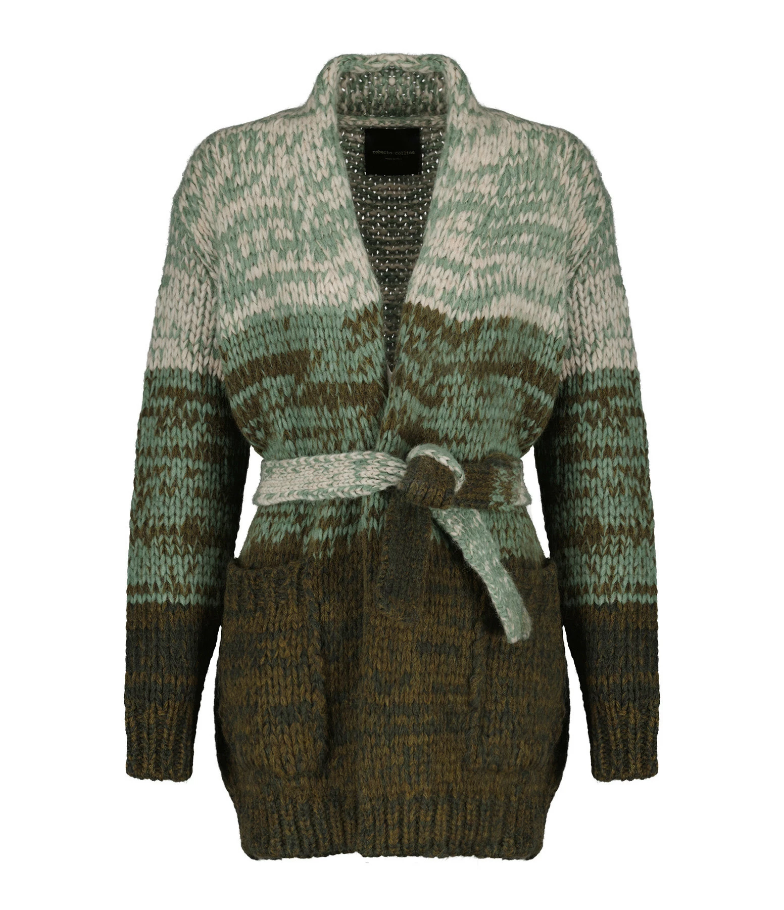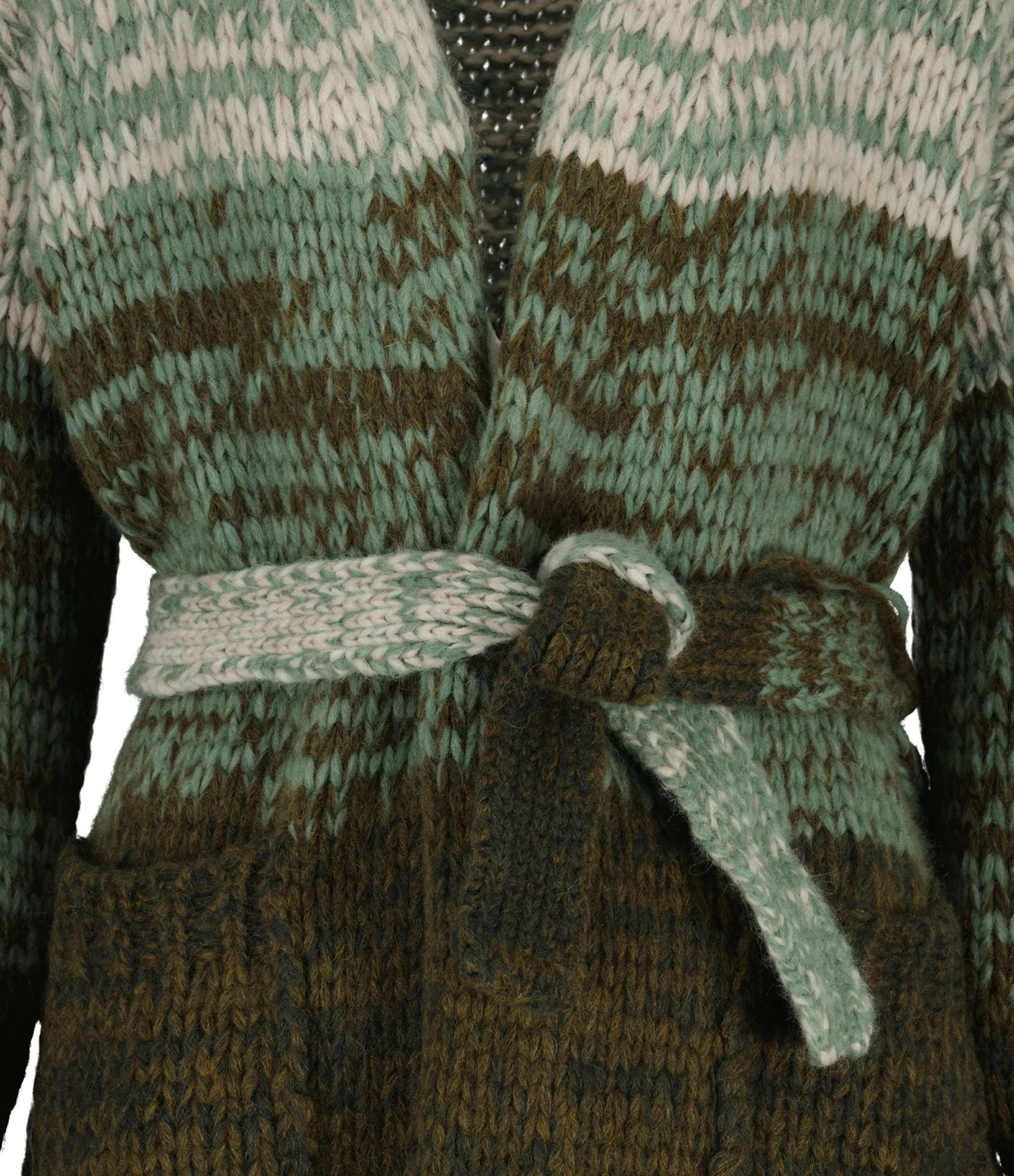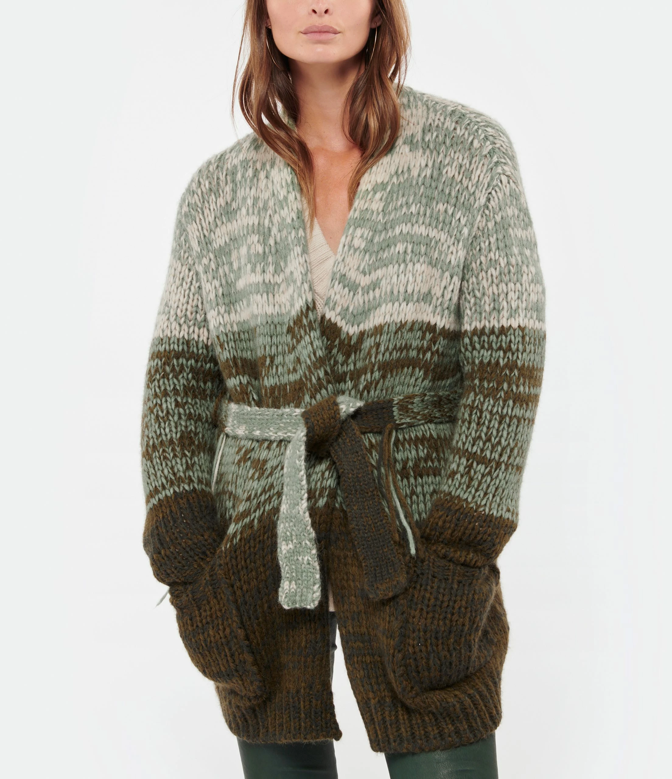 Cardigan long en maille à différentes nuances de vert. Col châle. Manches longues. Passants au niveau de la taille pour ceinture amovible assortie. Deux poches plaquées sur le devant. Coupe droite. Base droite.