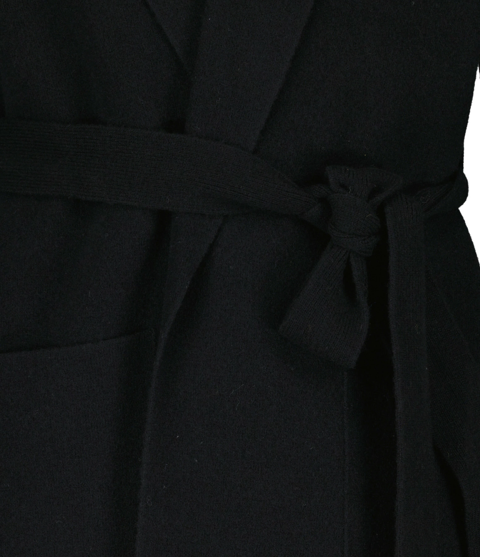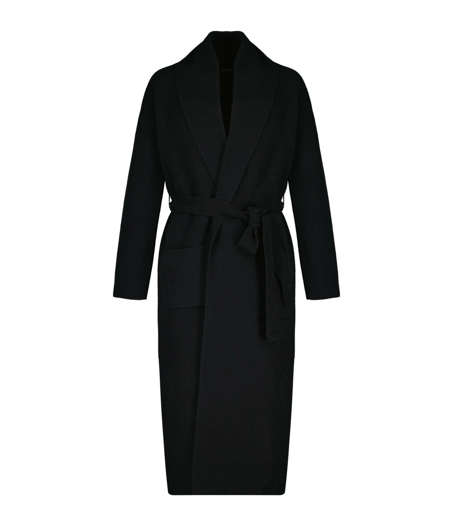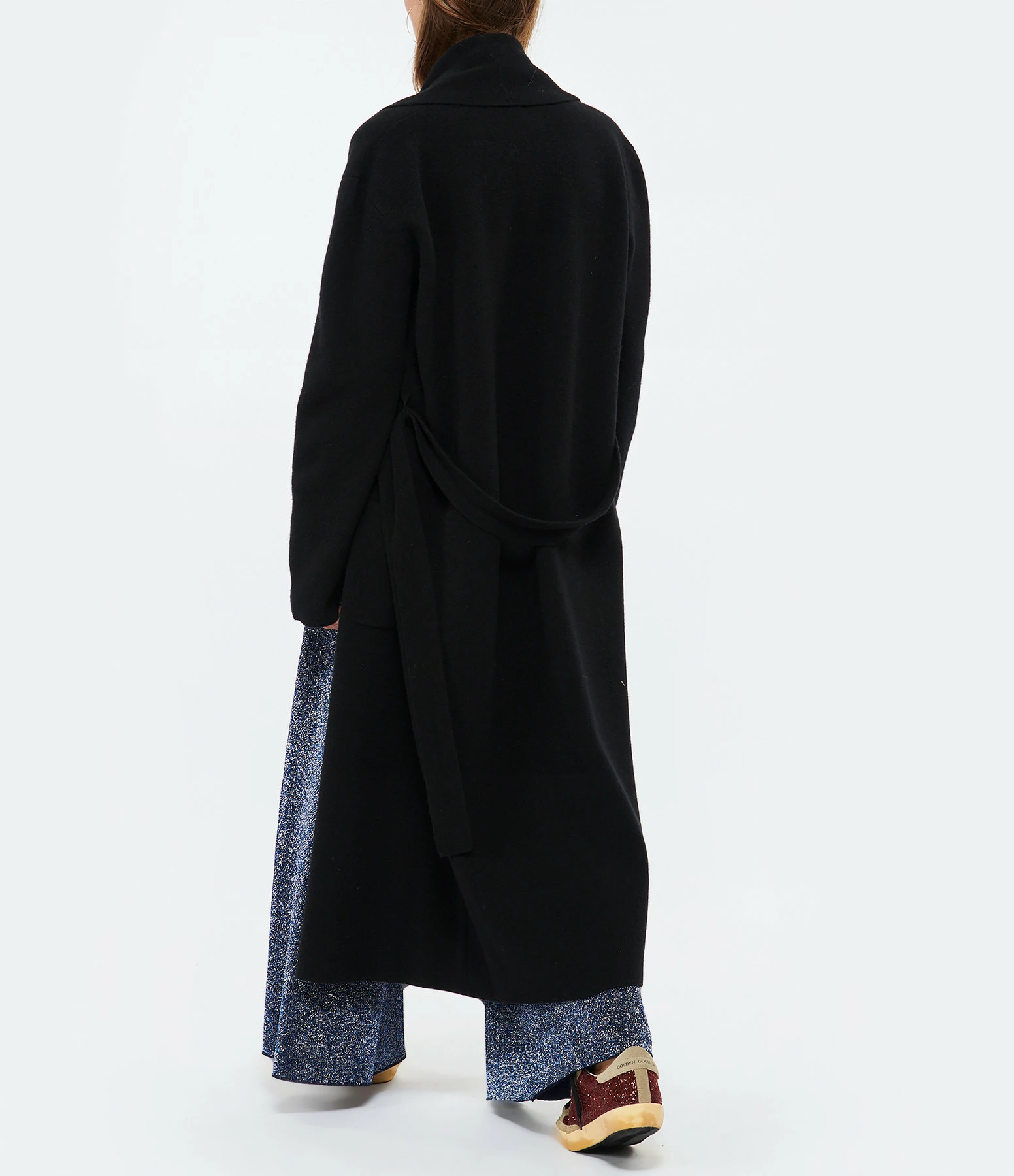 Manteau long en laine noir. Col châle. Manches longues. Passants au niveau de la taille pour ceinture amovible assortie à nouer. Deux poches plaquée sur le devant. Coupe ample. Base droite.