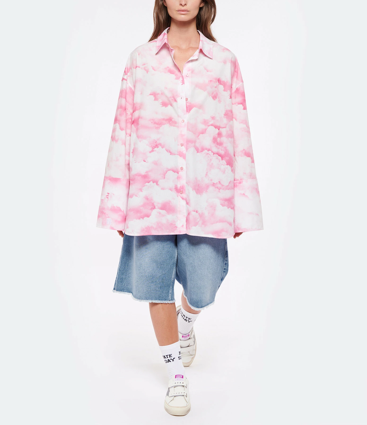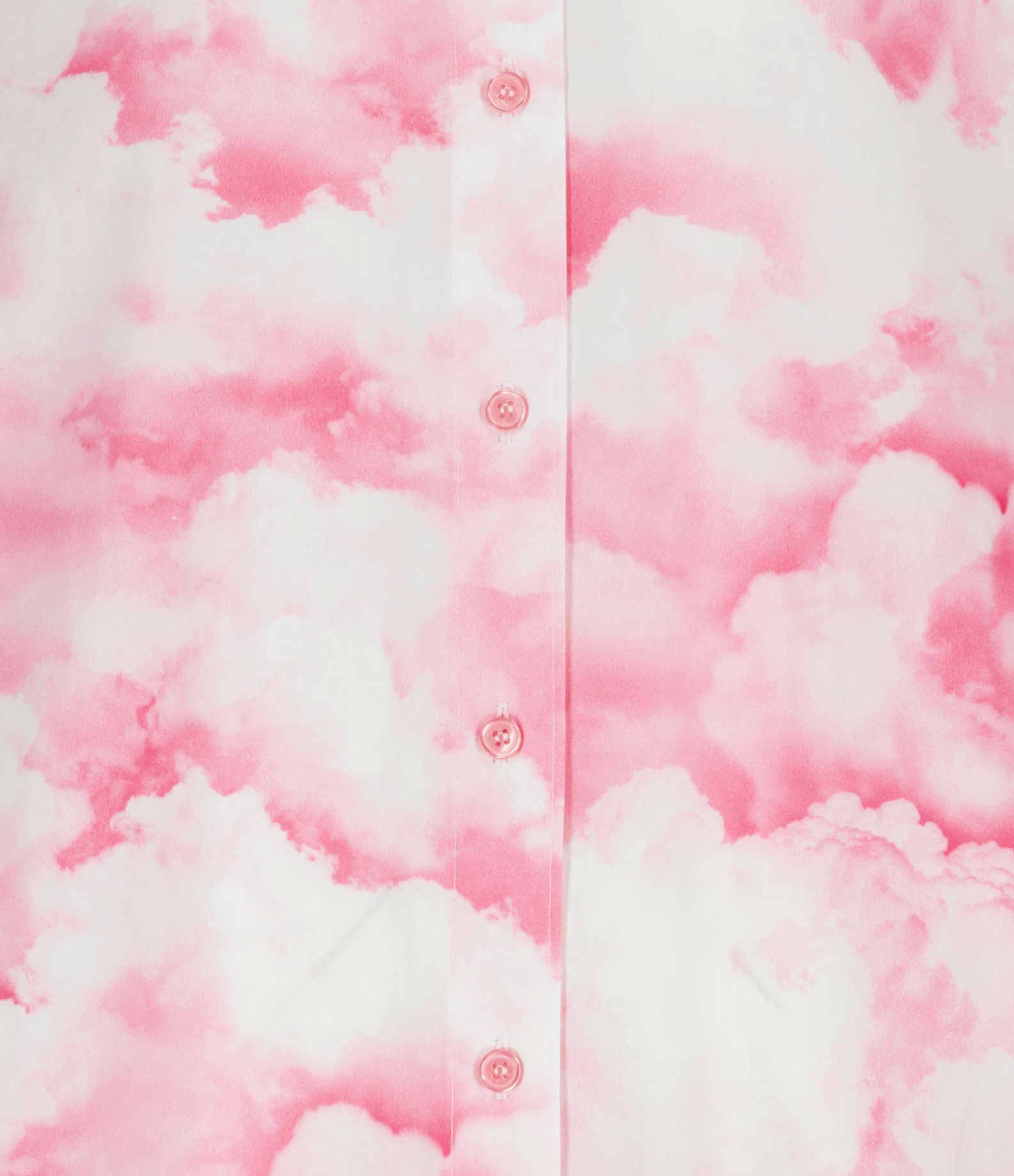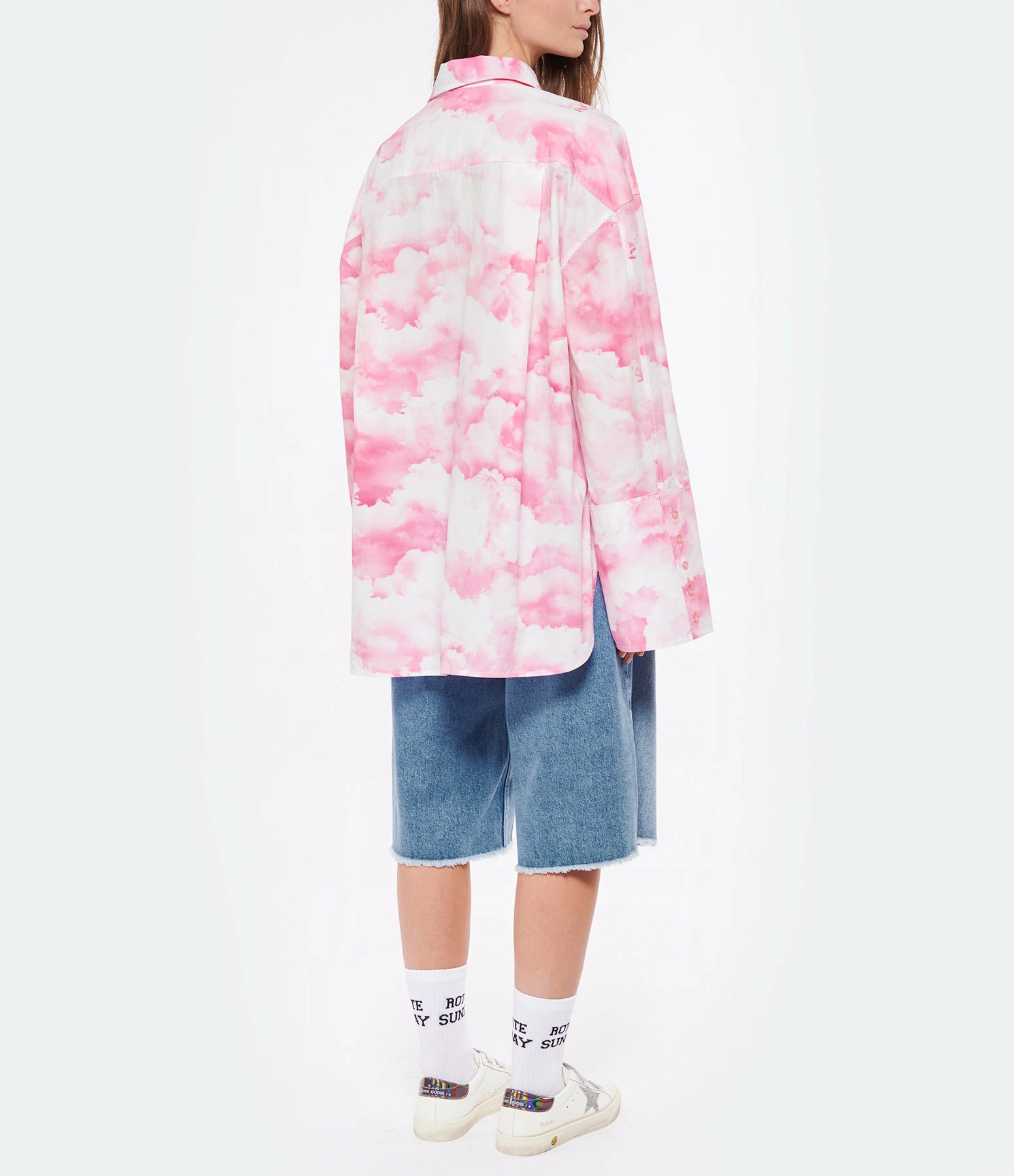 Chemise longue en coton à imprimé rose et blanc. Col chemise. Manches longues évasées. Fermeture boutonnée. Coupe ample. Base droite, plus courte à l’avant.