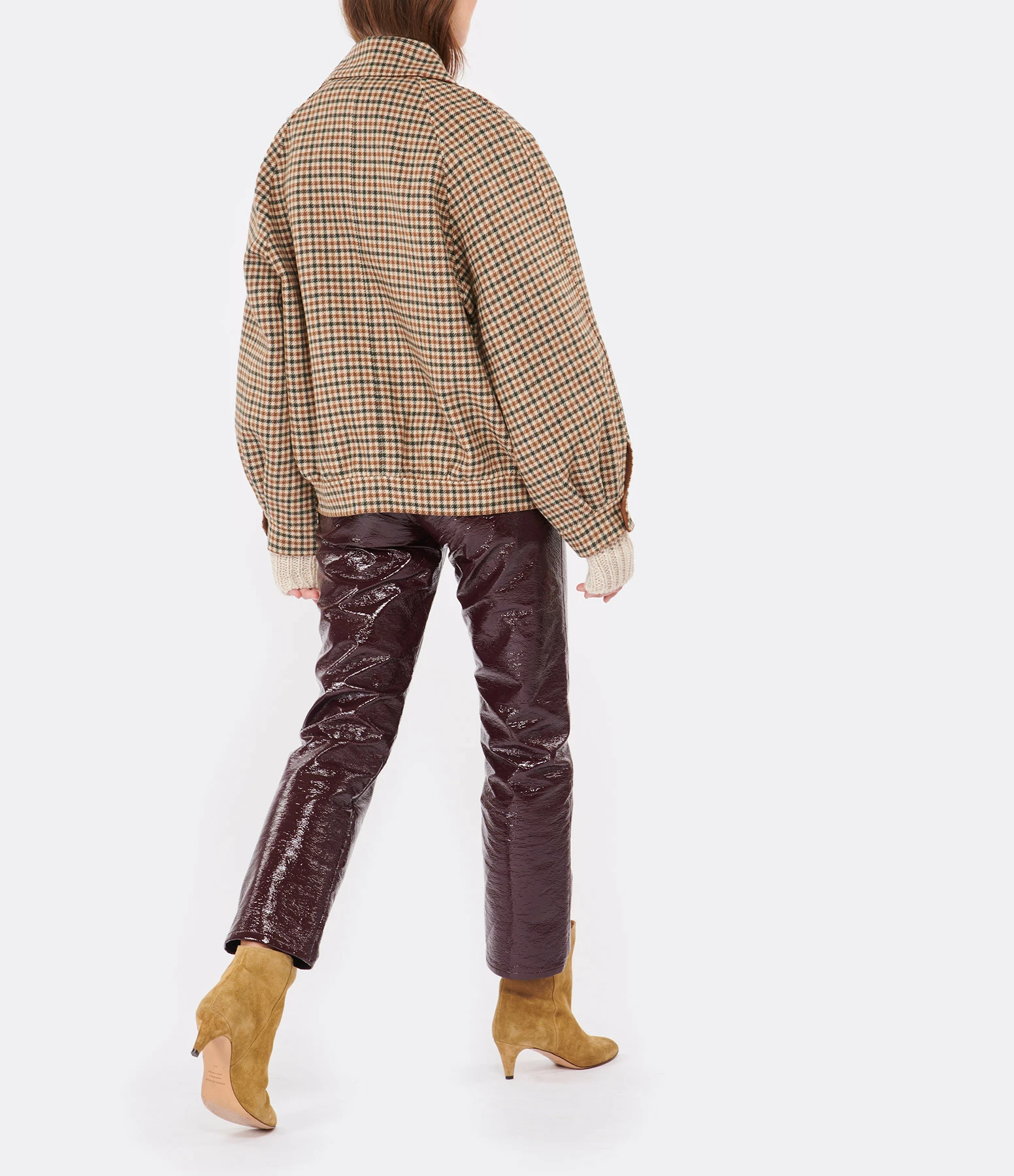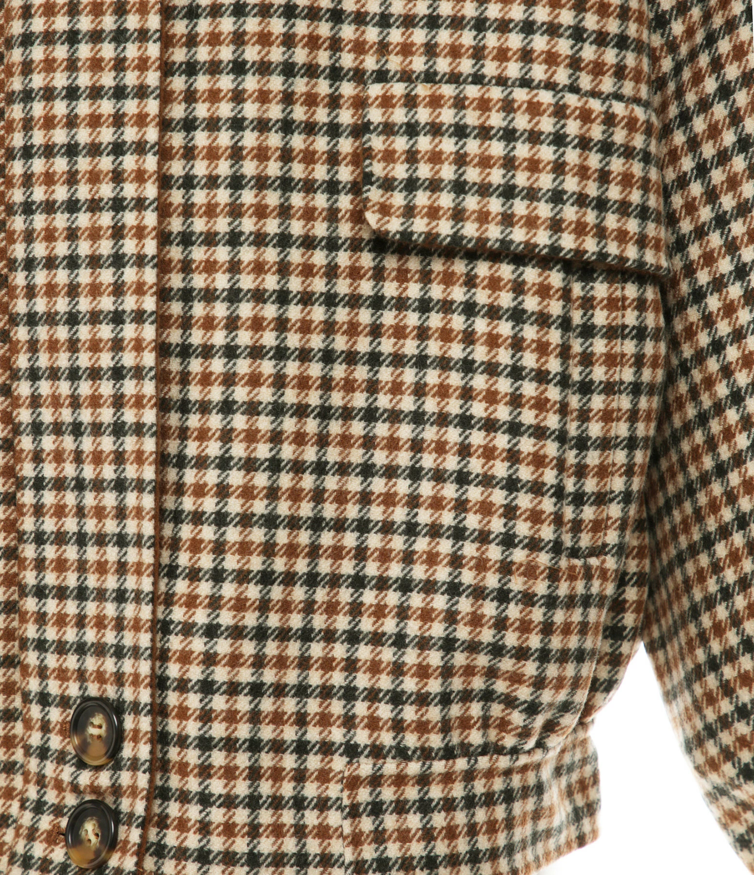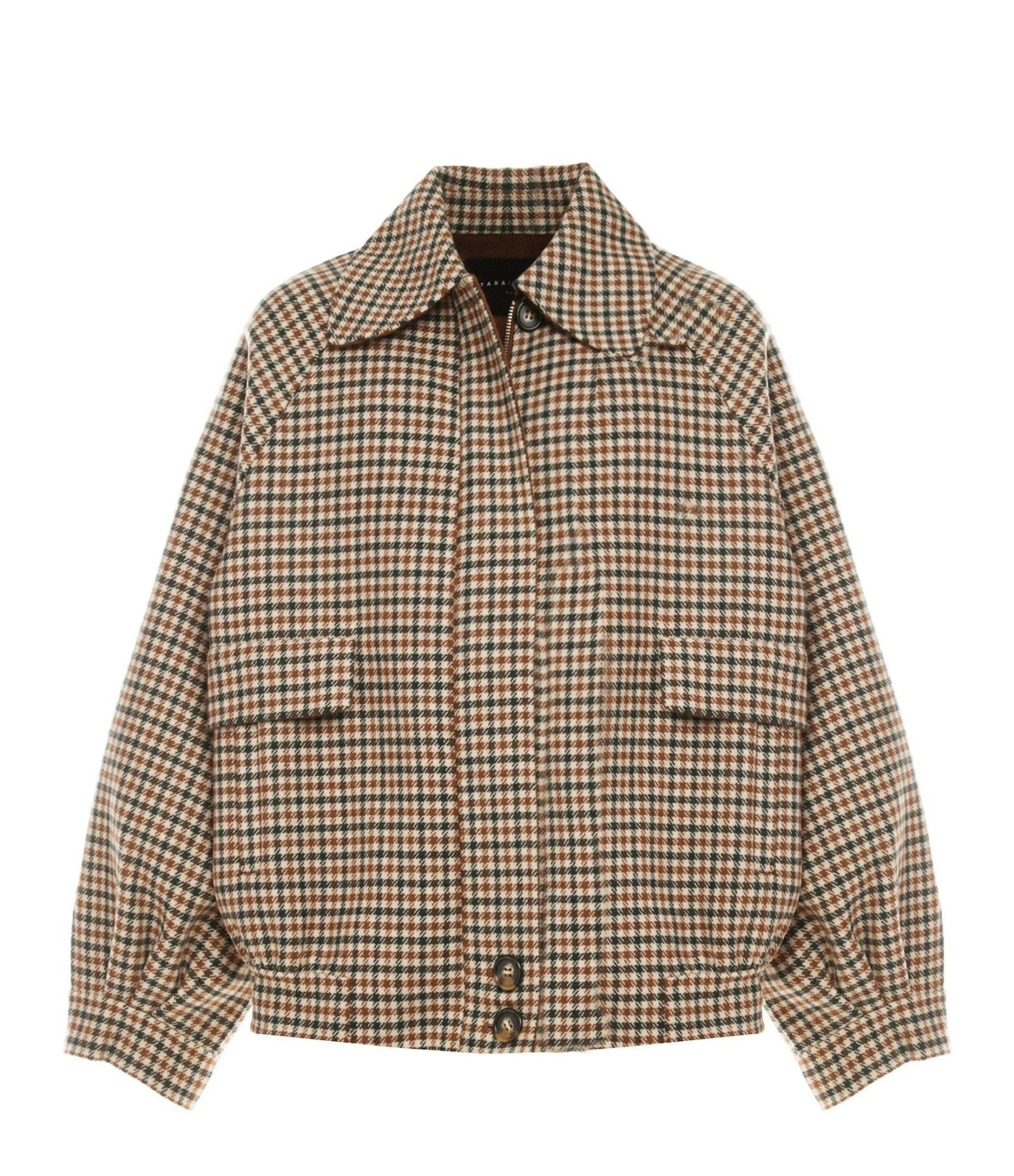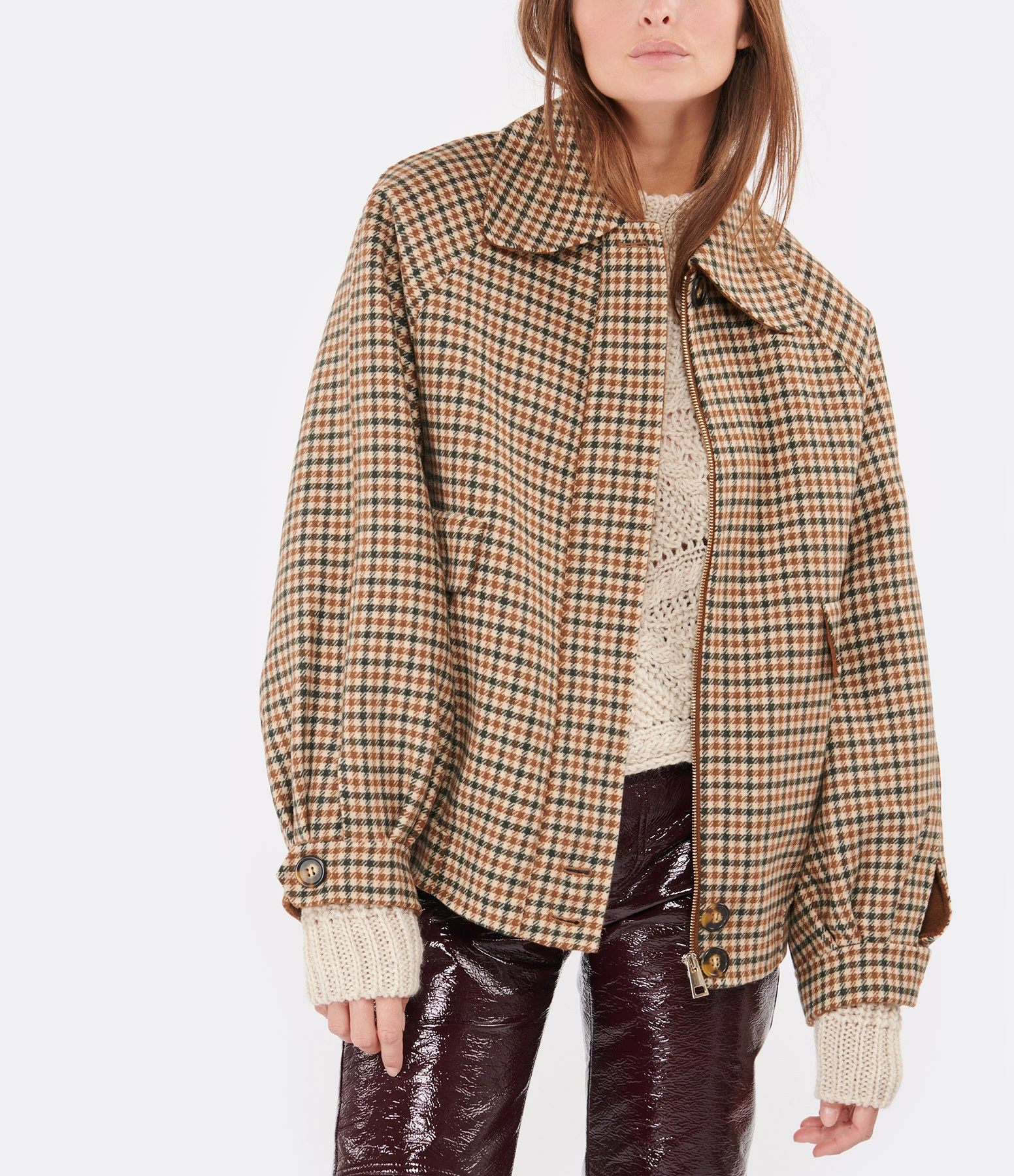 Blouson en laine mélangée imprimé pied de poule beige et marron. Col claudine. Manches longues raglan et avec fentes et poignets boutonnés et froncés. Fermeture zippée cachée et boutonnée. Deux poches raglan sur le devant avec rabat. Coupe droite large. Base droite resserrée.