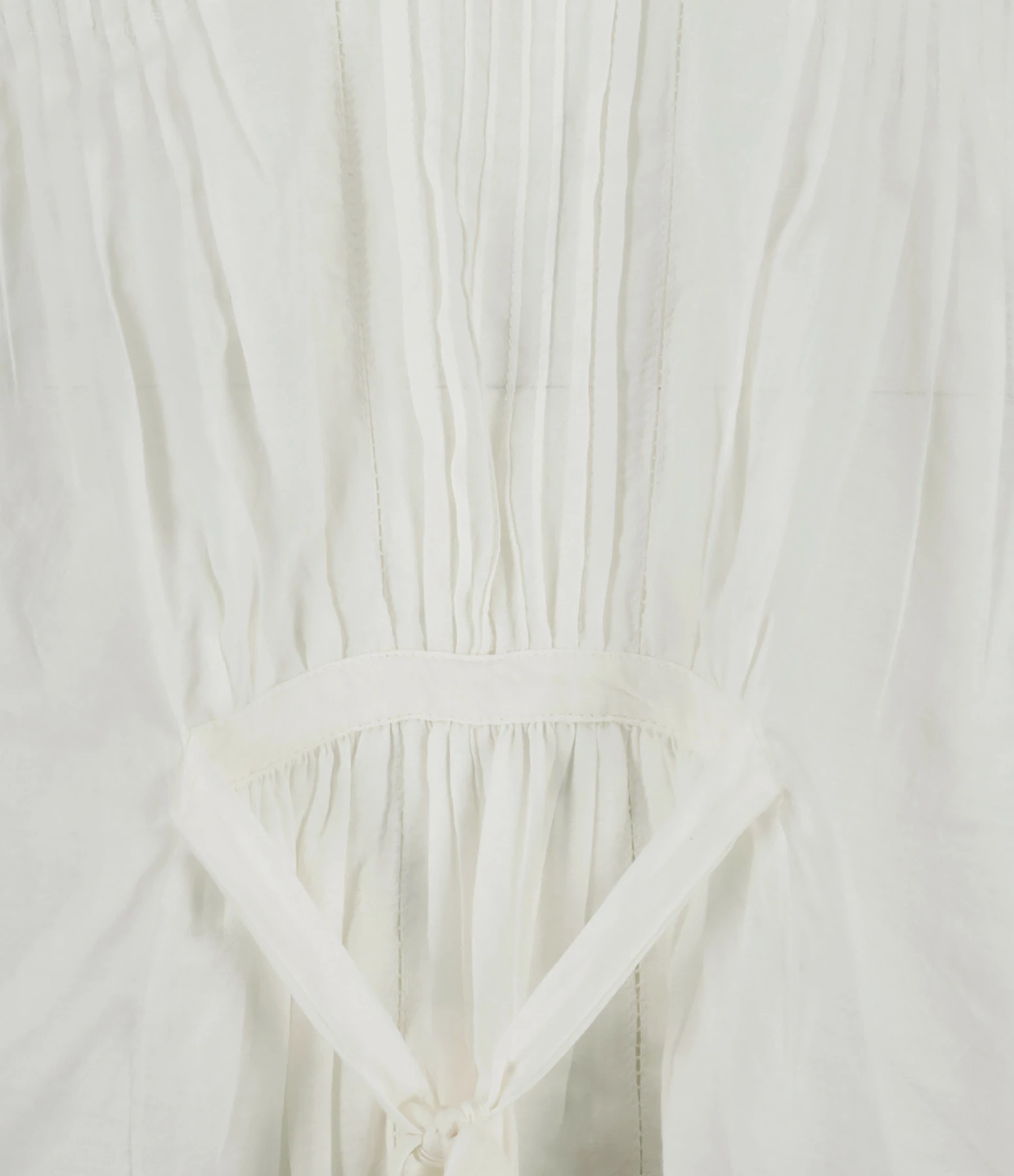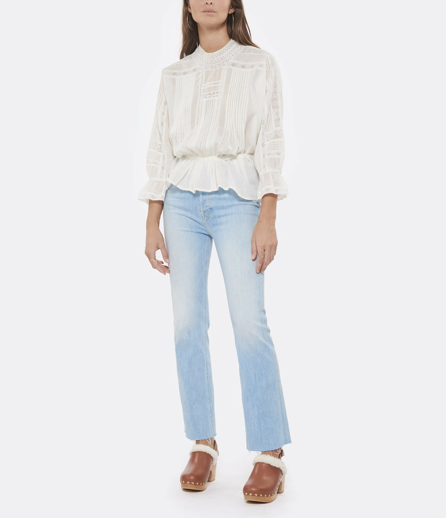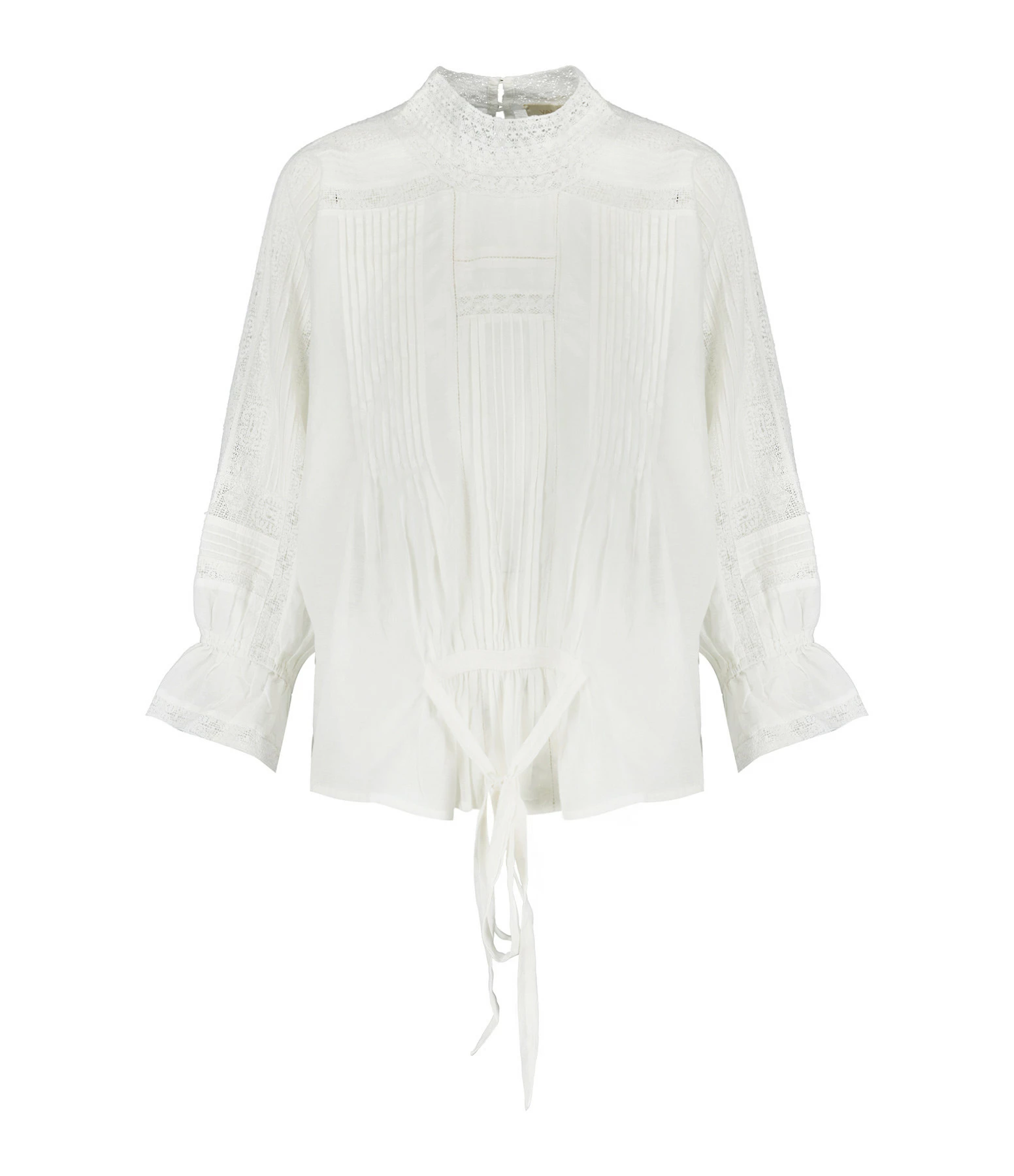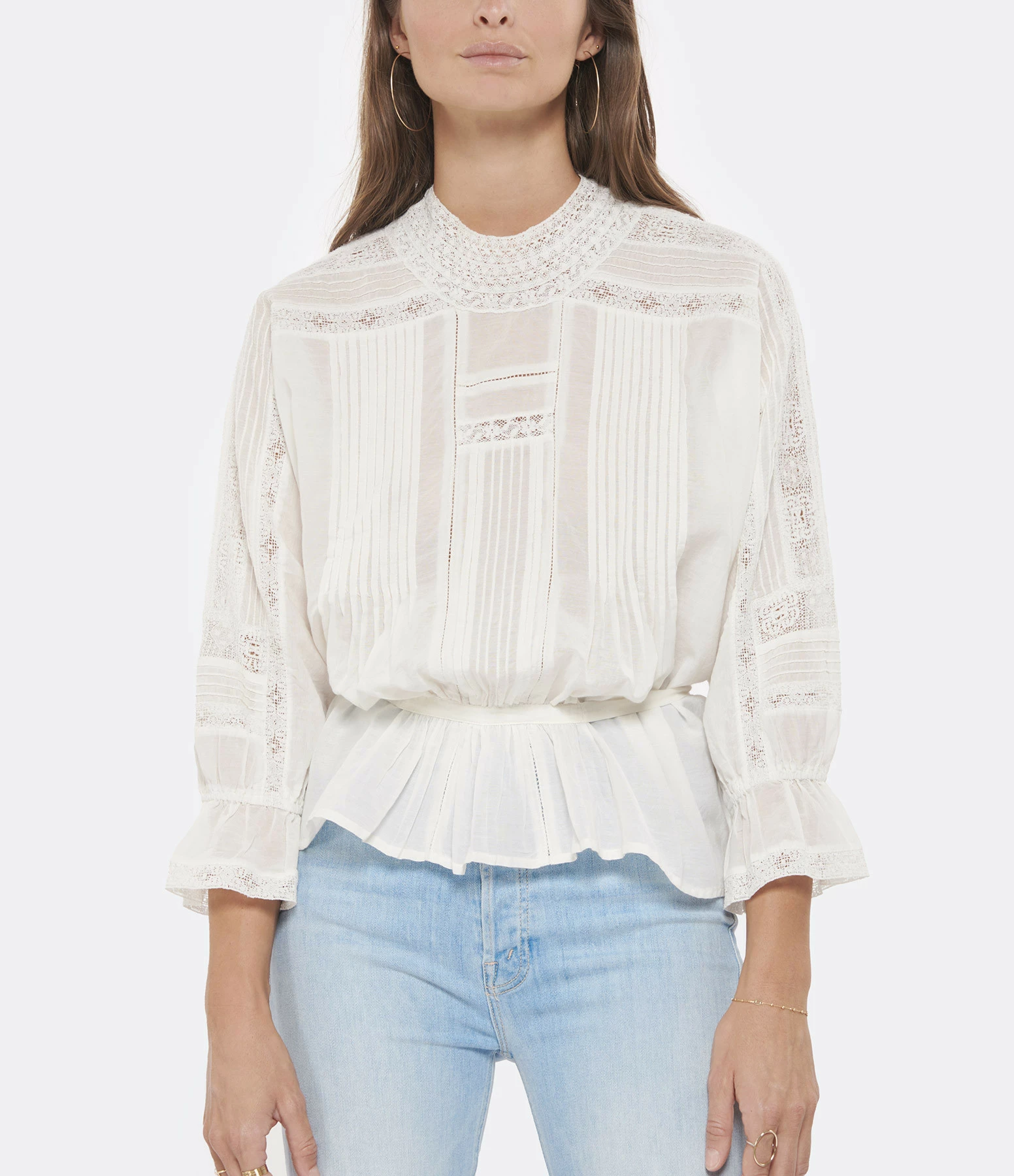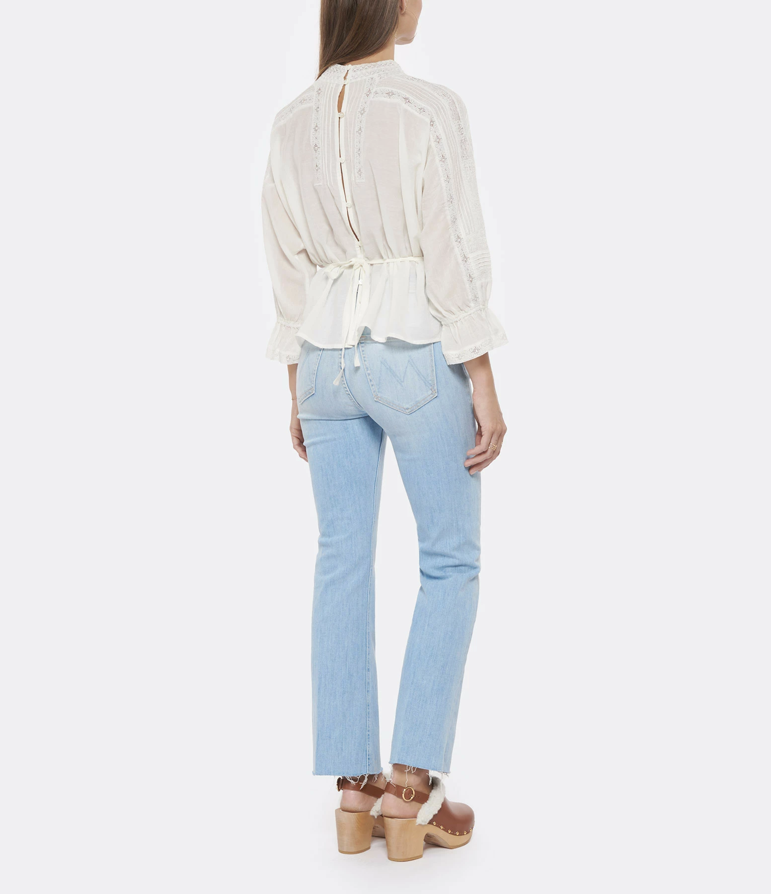 Blouse en coton blanc. Col à volants avec dentelle. Manches longues resserrées aux poignet par élastique et volants en dentelles aux extrémités. Fermeture par boutons nacré. Lien de serrage à l’arrière. Coupe droite. Base droite.