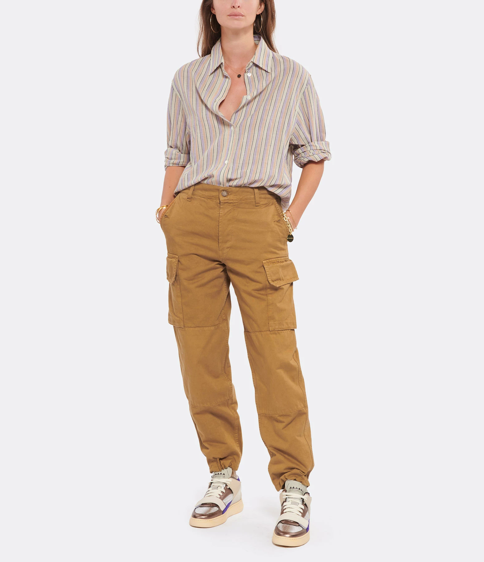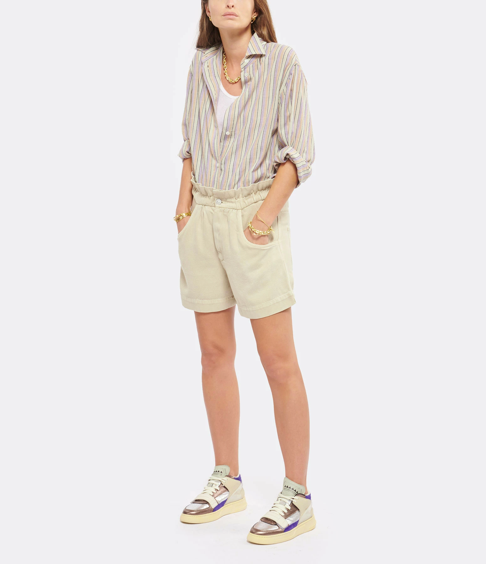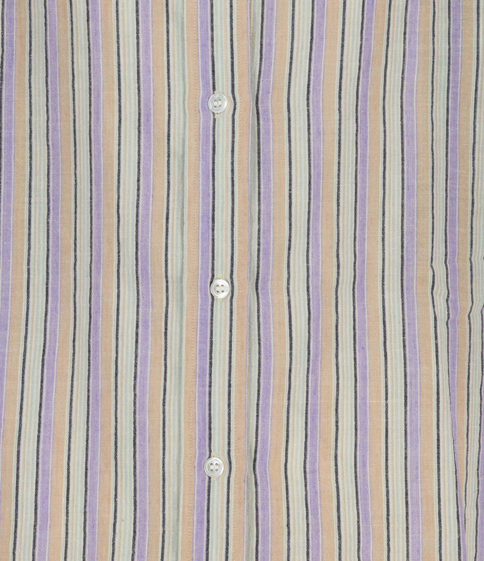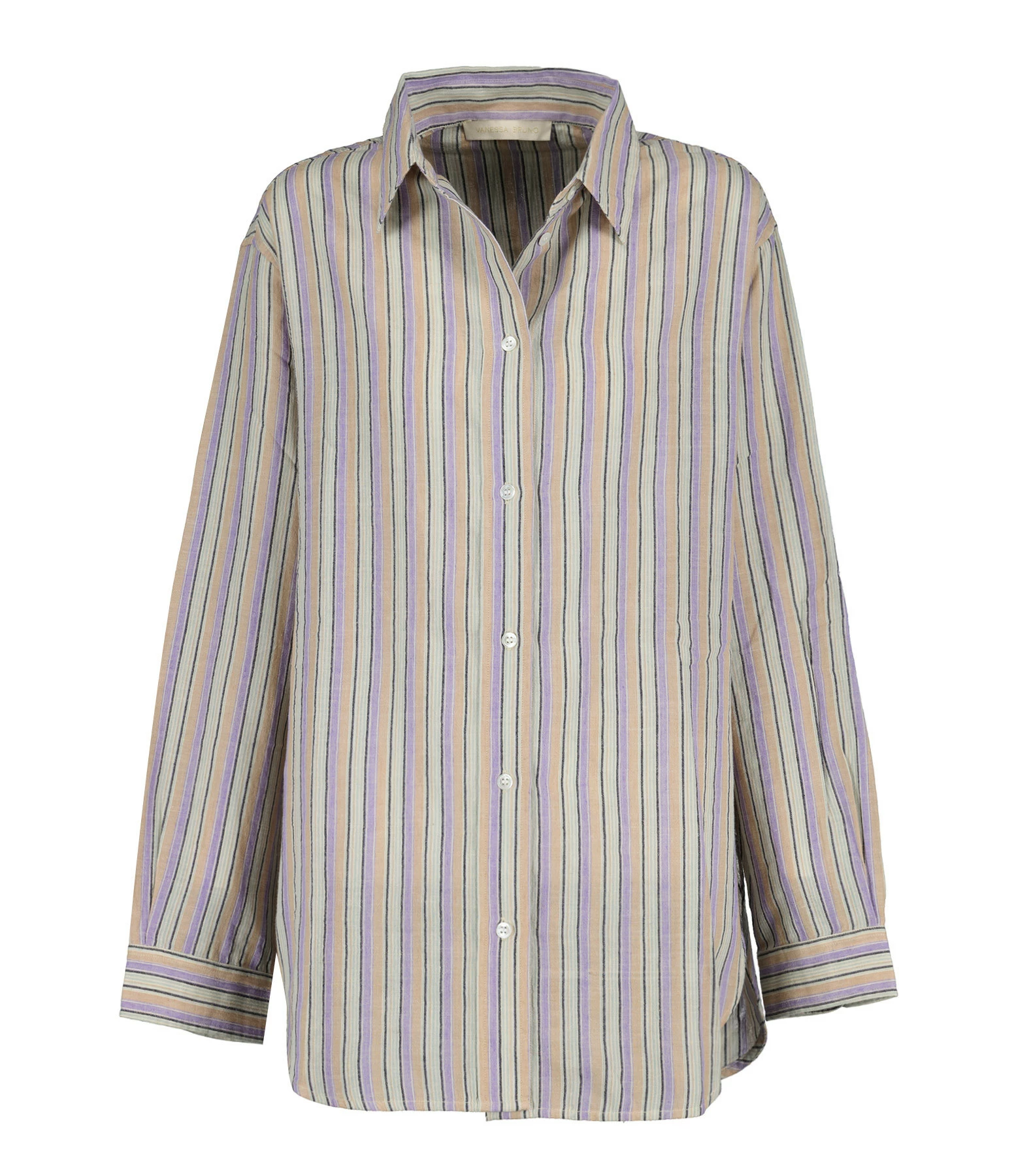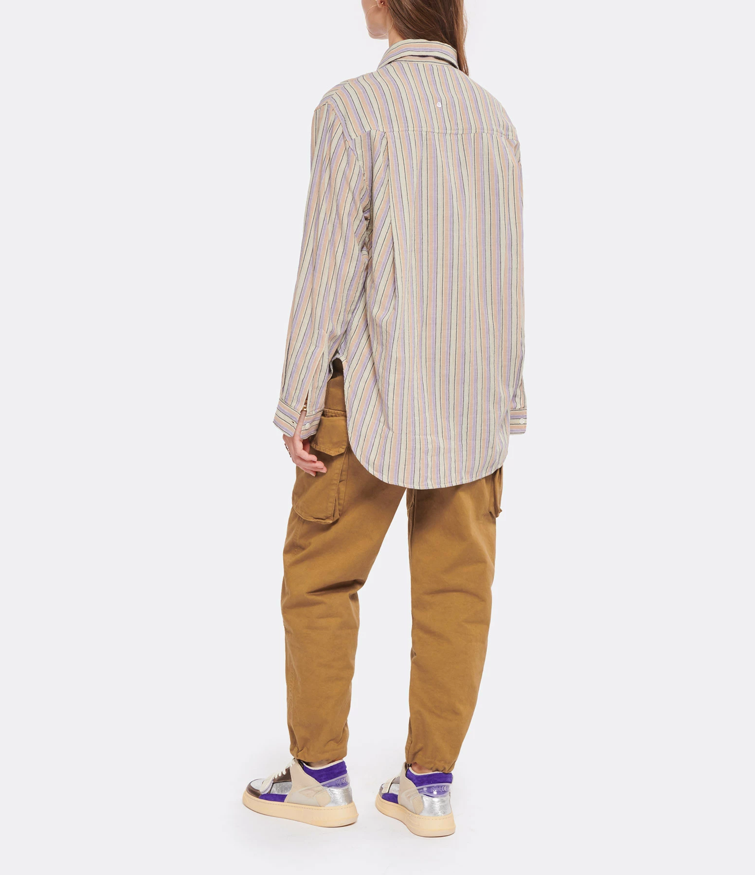 Chemise en coton à rayures multicolores. Col chemisier. Manches longues avec fentes et poignets boutonnés. Fermeture boutonnée sur le devant. Boutons nacrés blancs. Dos ailes d’anges. Fentes latérales. Coupe droite large. Base à la coupe liquette d’homme. Non doublée.