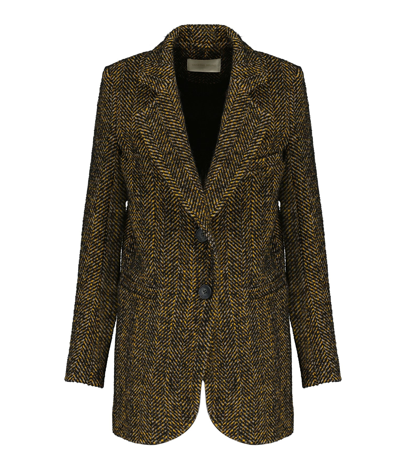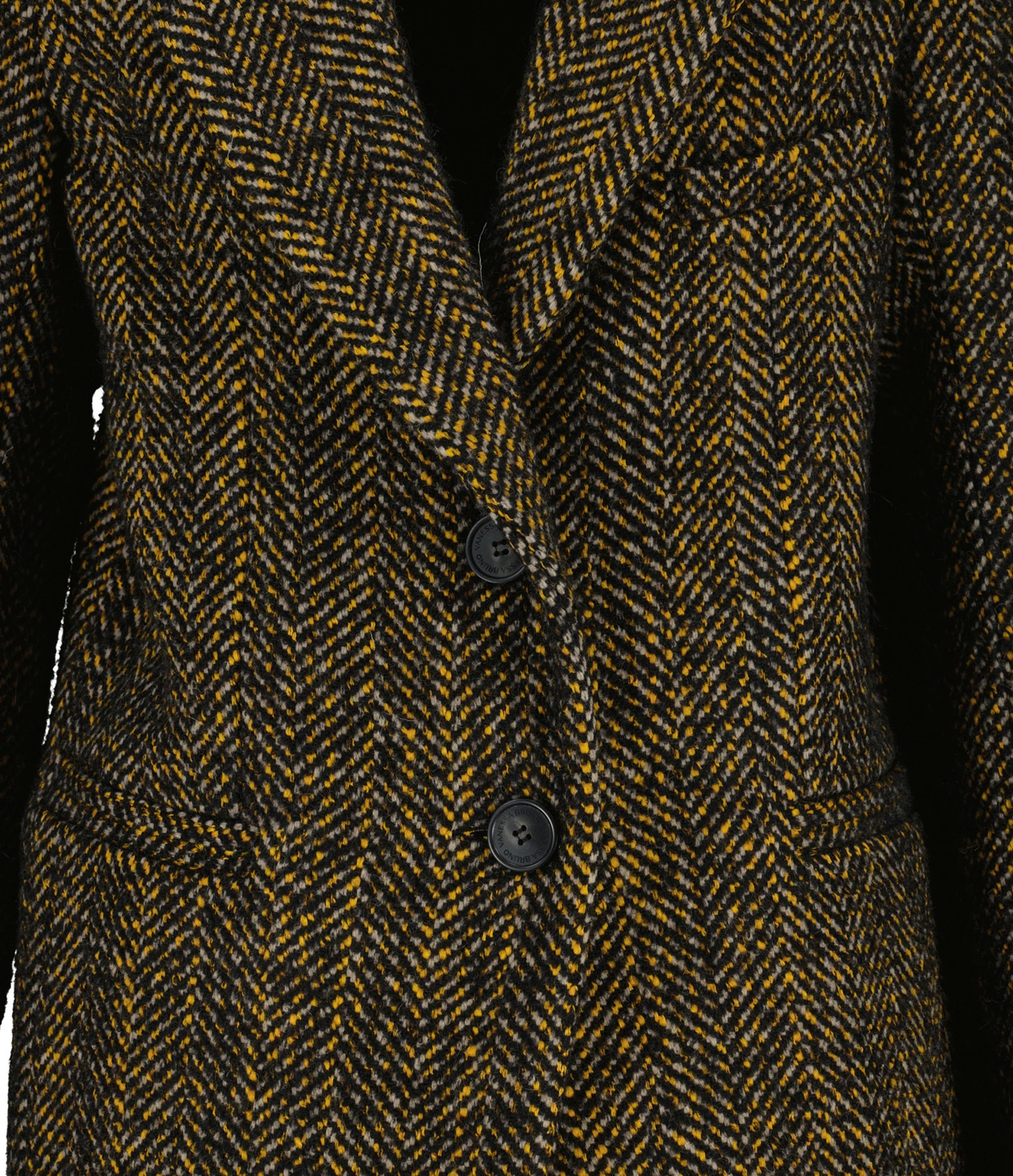 Veste blazer en laine mélangée à motifs chevrons noir et marron. Col tailleur cranté. Manches longues tailleur. Fermeture boutonnée simple sur le devant. Boutons noir effet corne. Trois poches raglan sur le devant. Une fente milieu dos. Coupe droite. Base arrondie. Doublée.