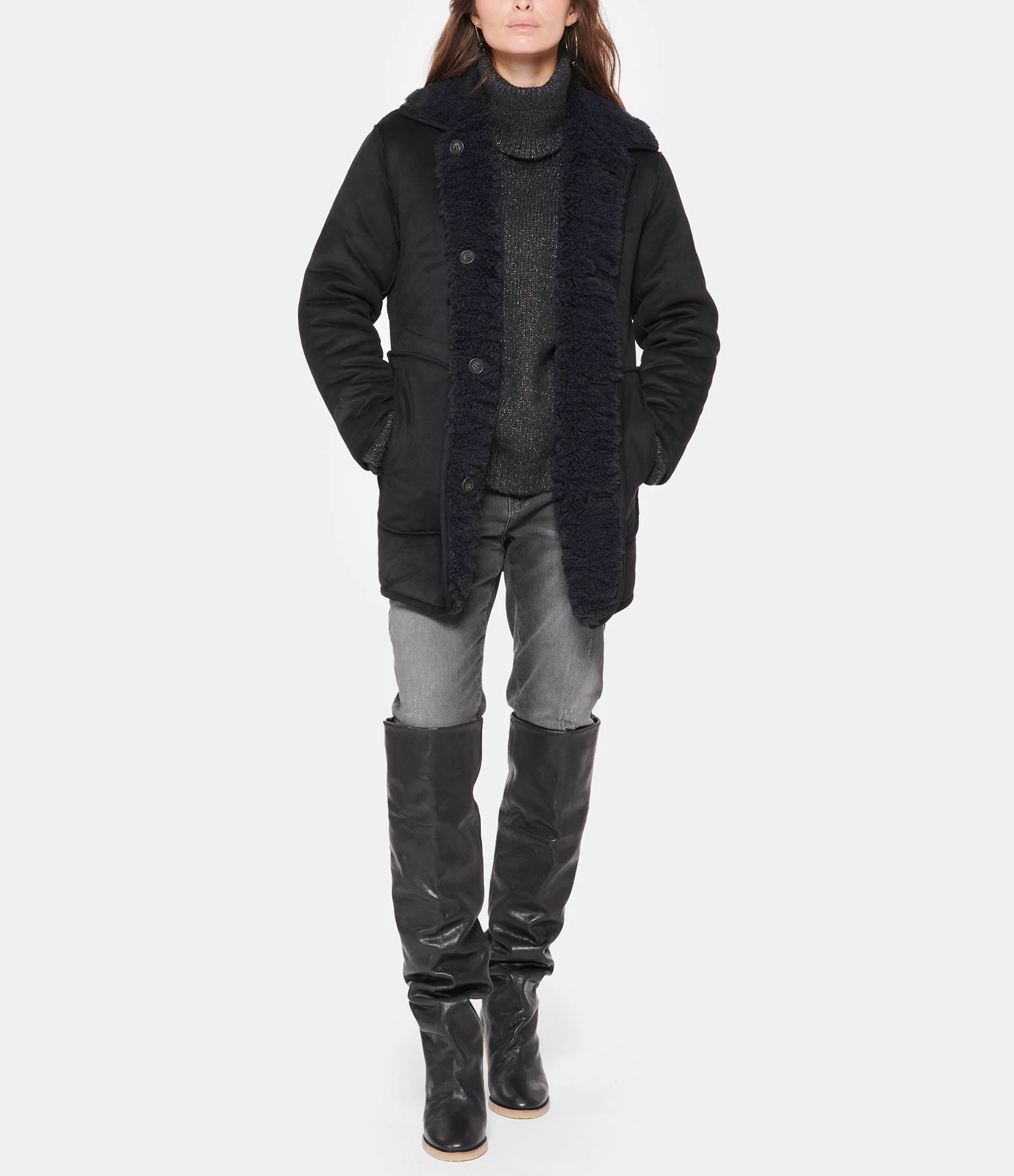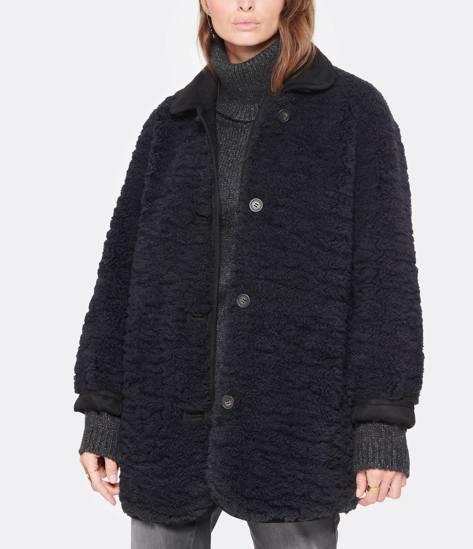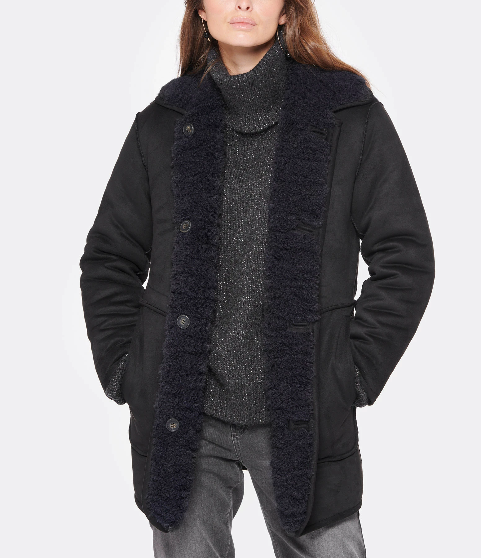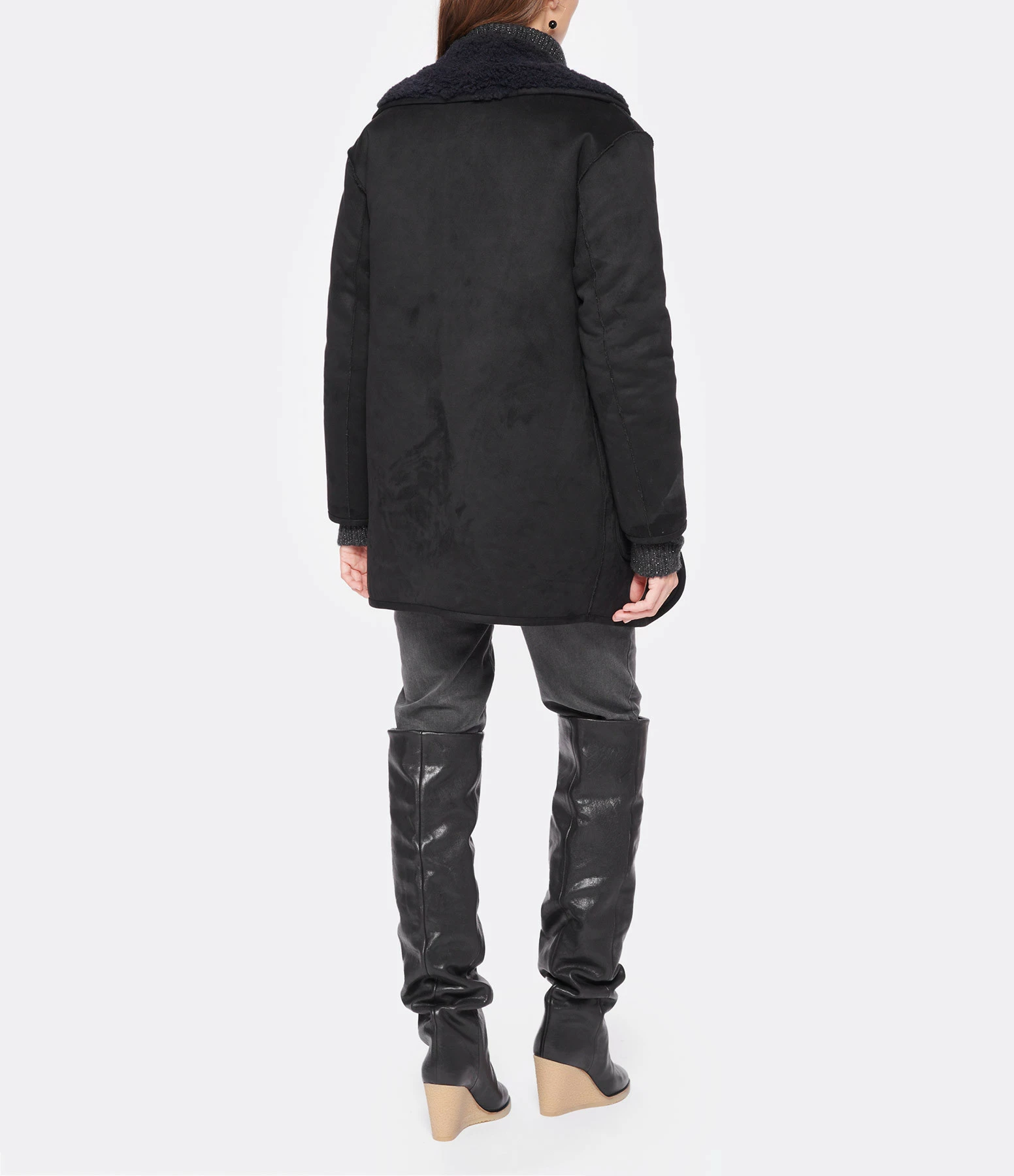 Veste courte réversible en fausse peau de mouton noir : une face fausse fourrure et une face faux cuir suédé. Col chemisier. Manches longues. Fermeture boutonnée simple sur le devant. Boutons noir effet corne. Deux poches raglan sur le devant de chaque face. Coupe ample. Base arrondie.
