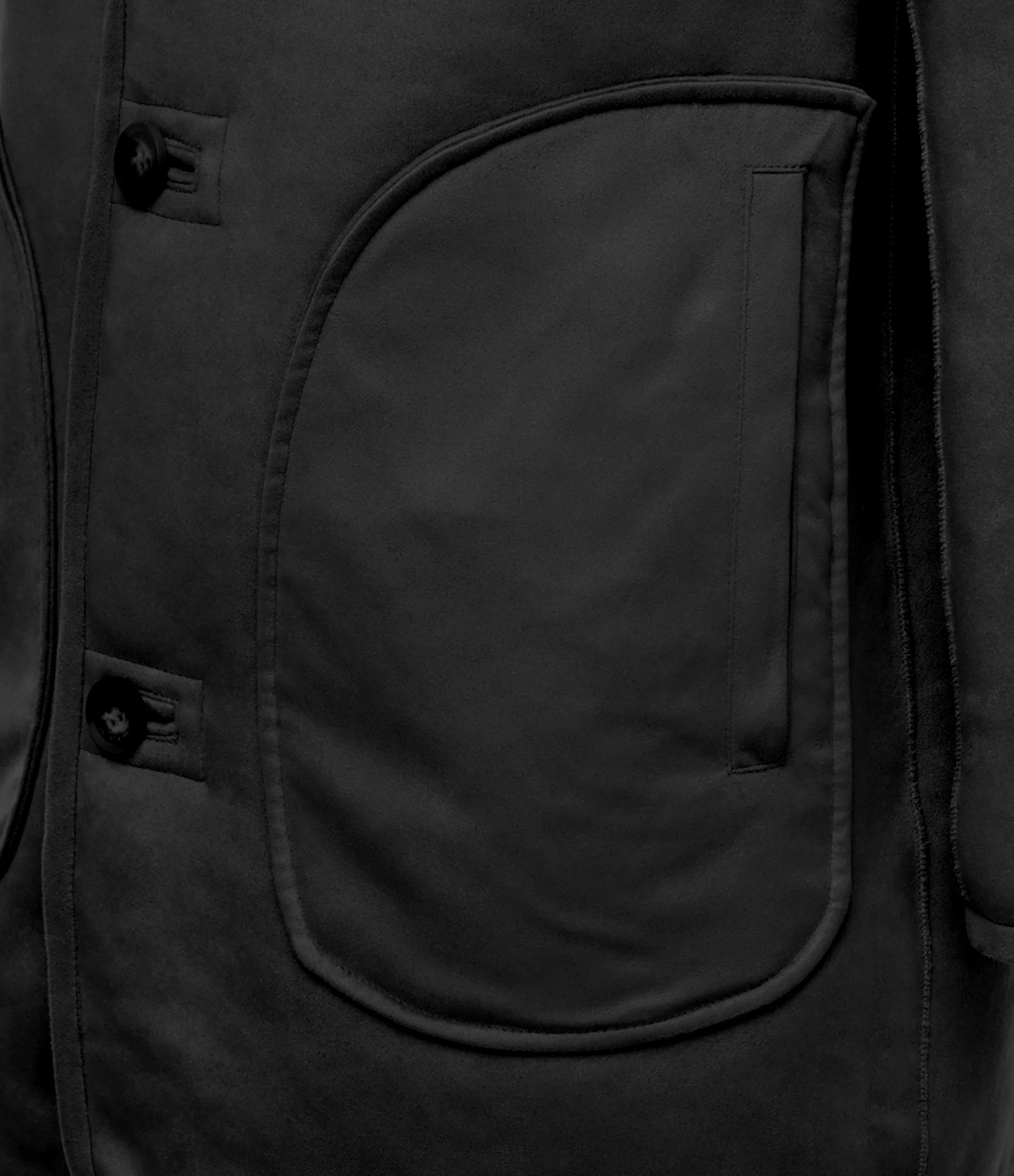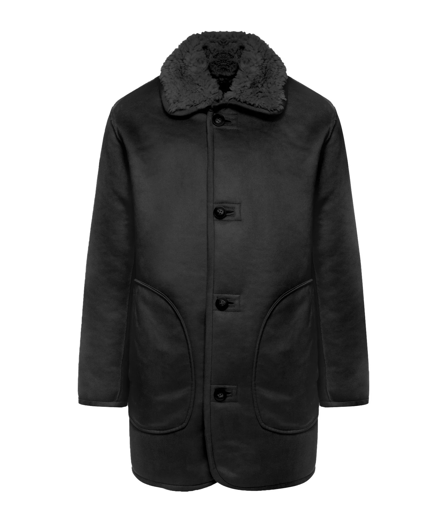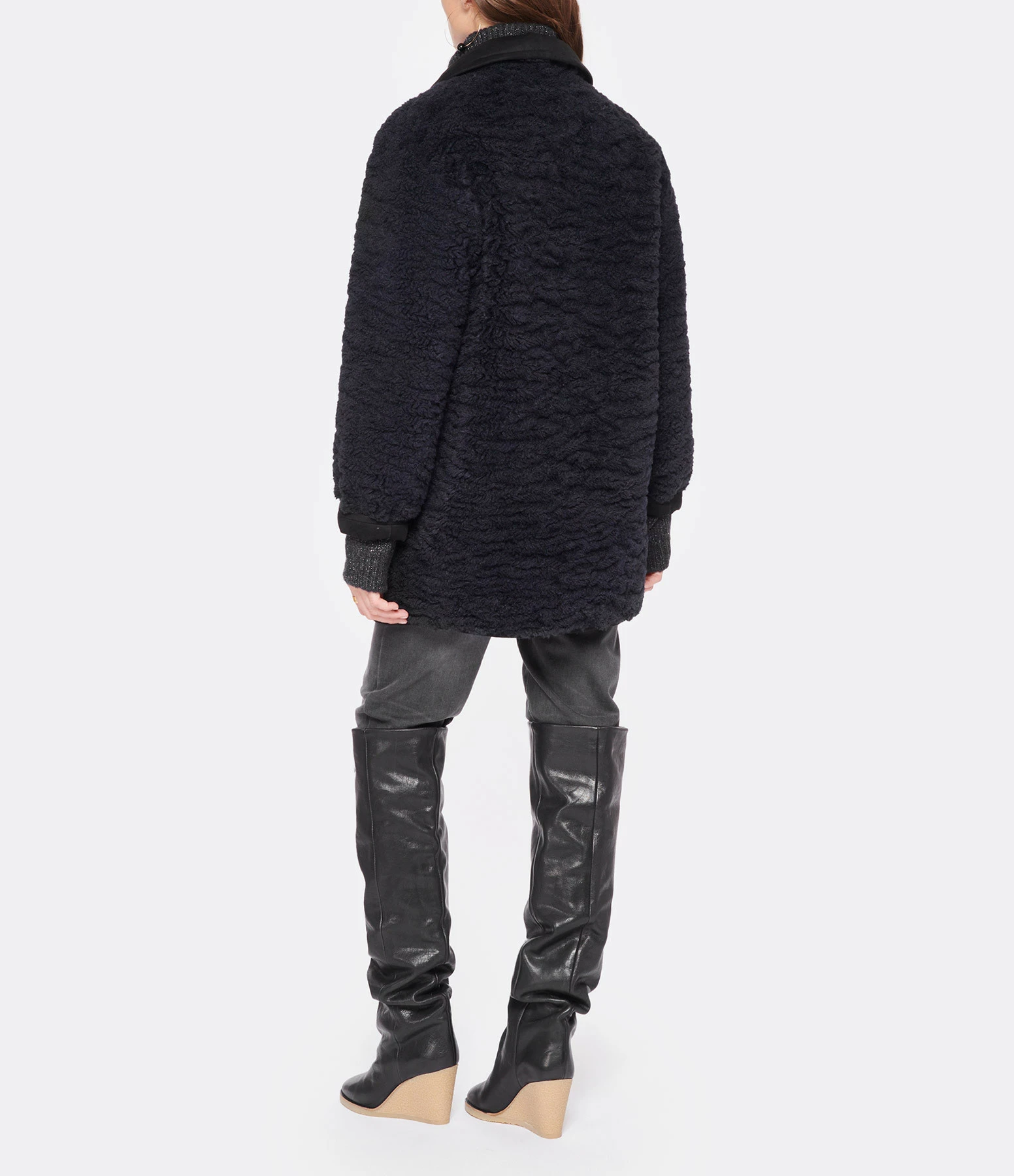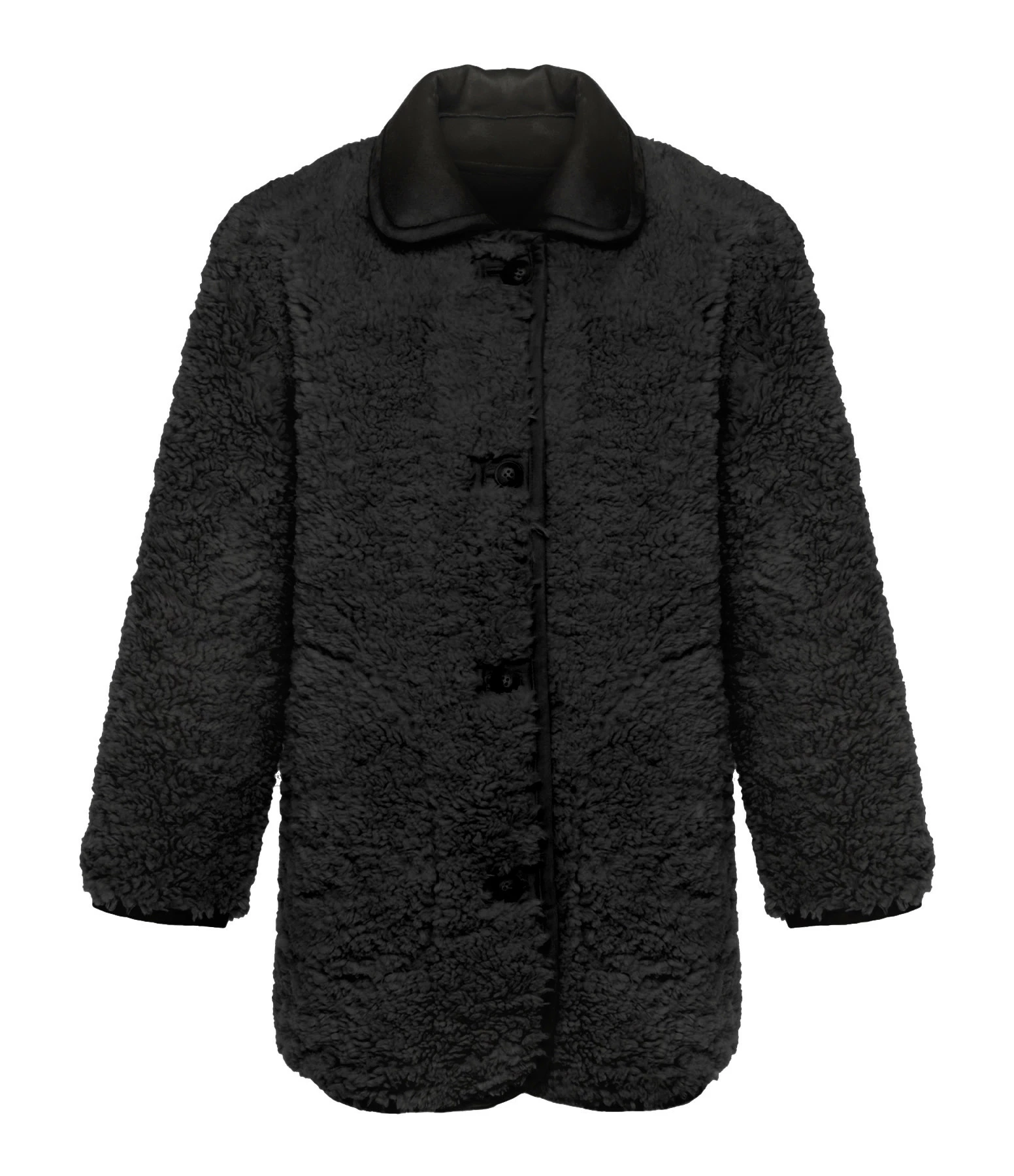 Veste courte réversible en fausse peau de mouton noir : une face fausse fourrure et une face faux cuir suédé. Col chemisier. Manches longues. Fermeture boutonnée simple sur le devant. Boutons noir effet corne. Deux poches raglan sur le devant de chaque face. Coupe ample. Base arrondie.