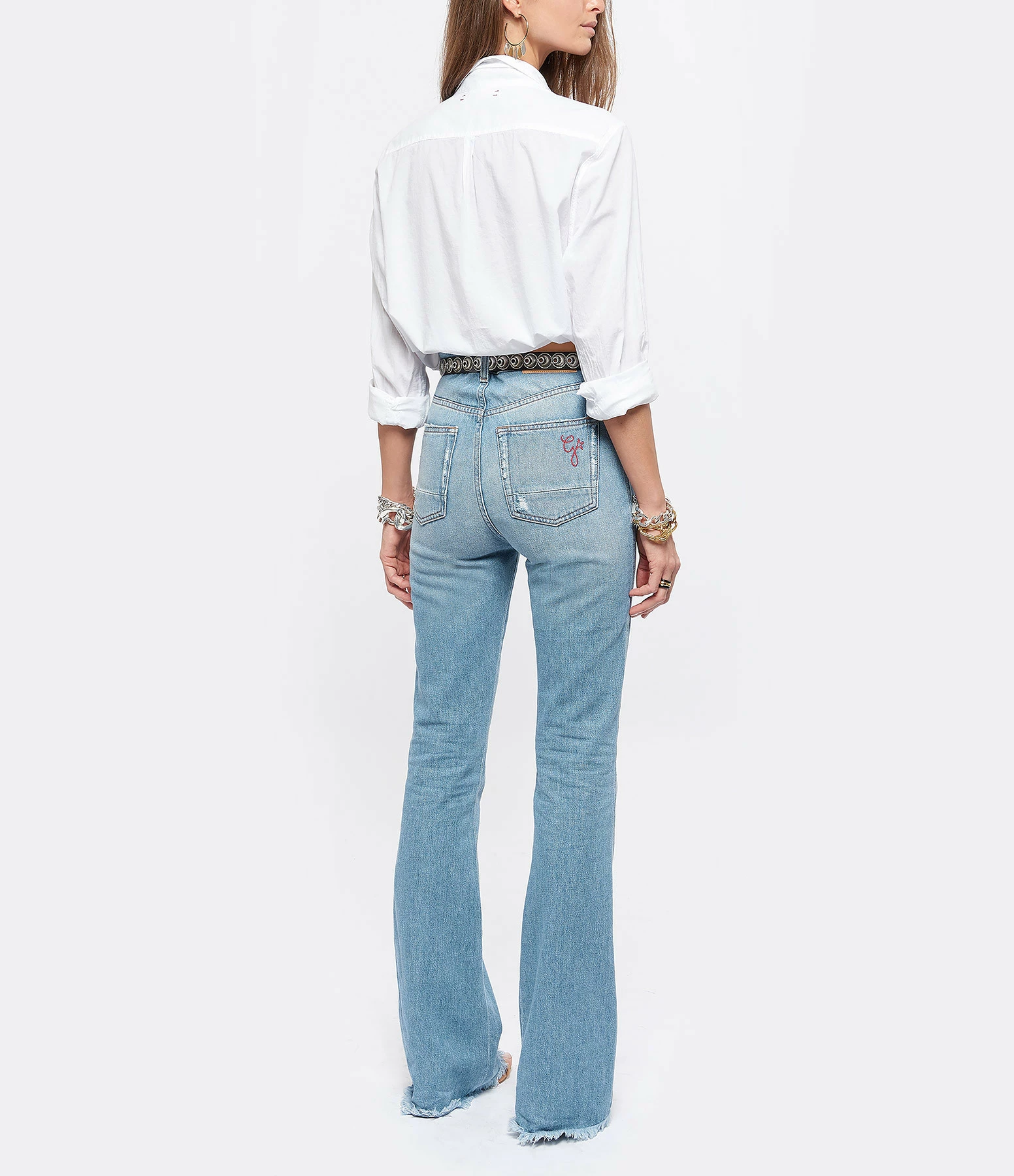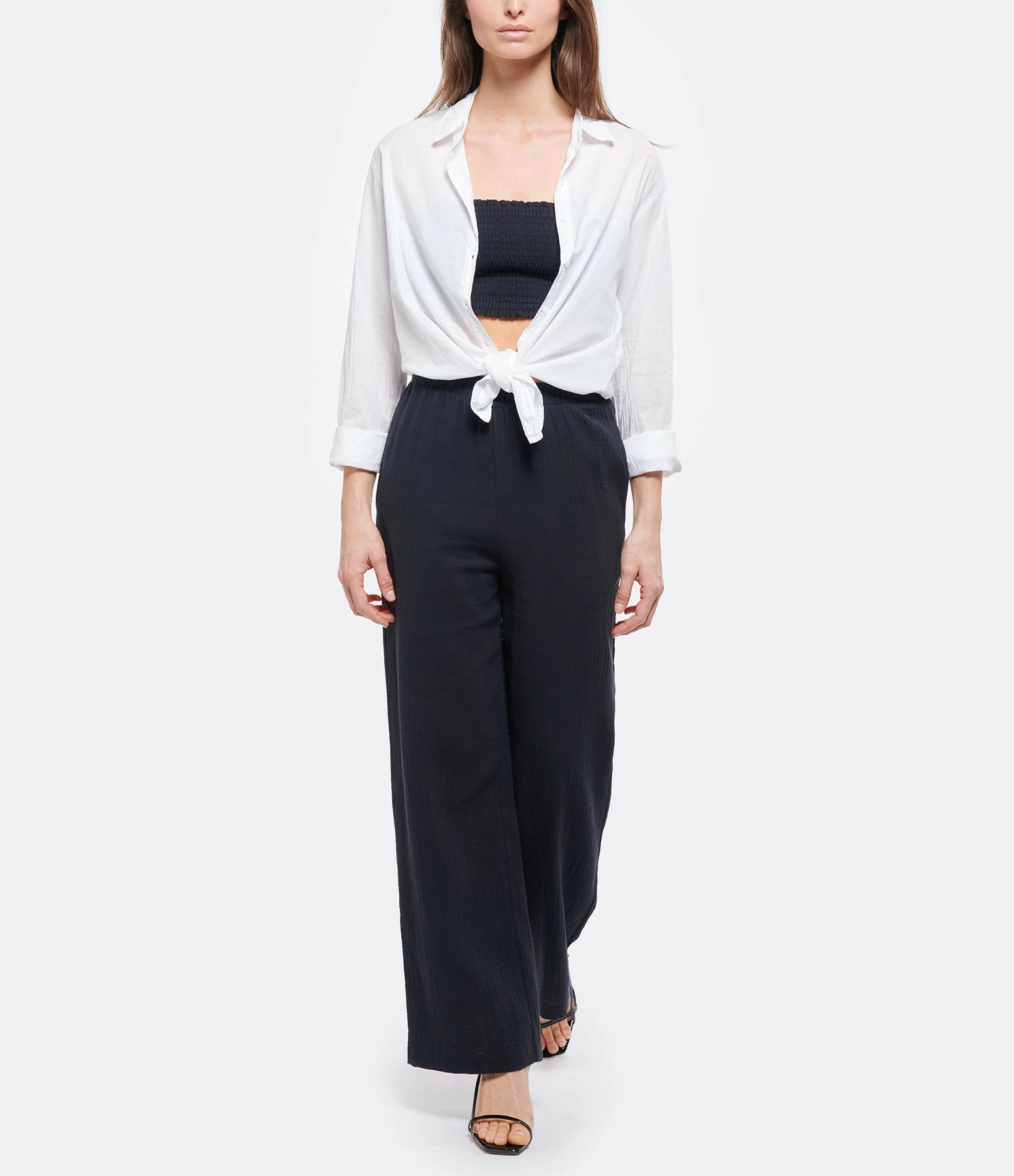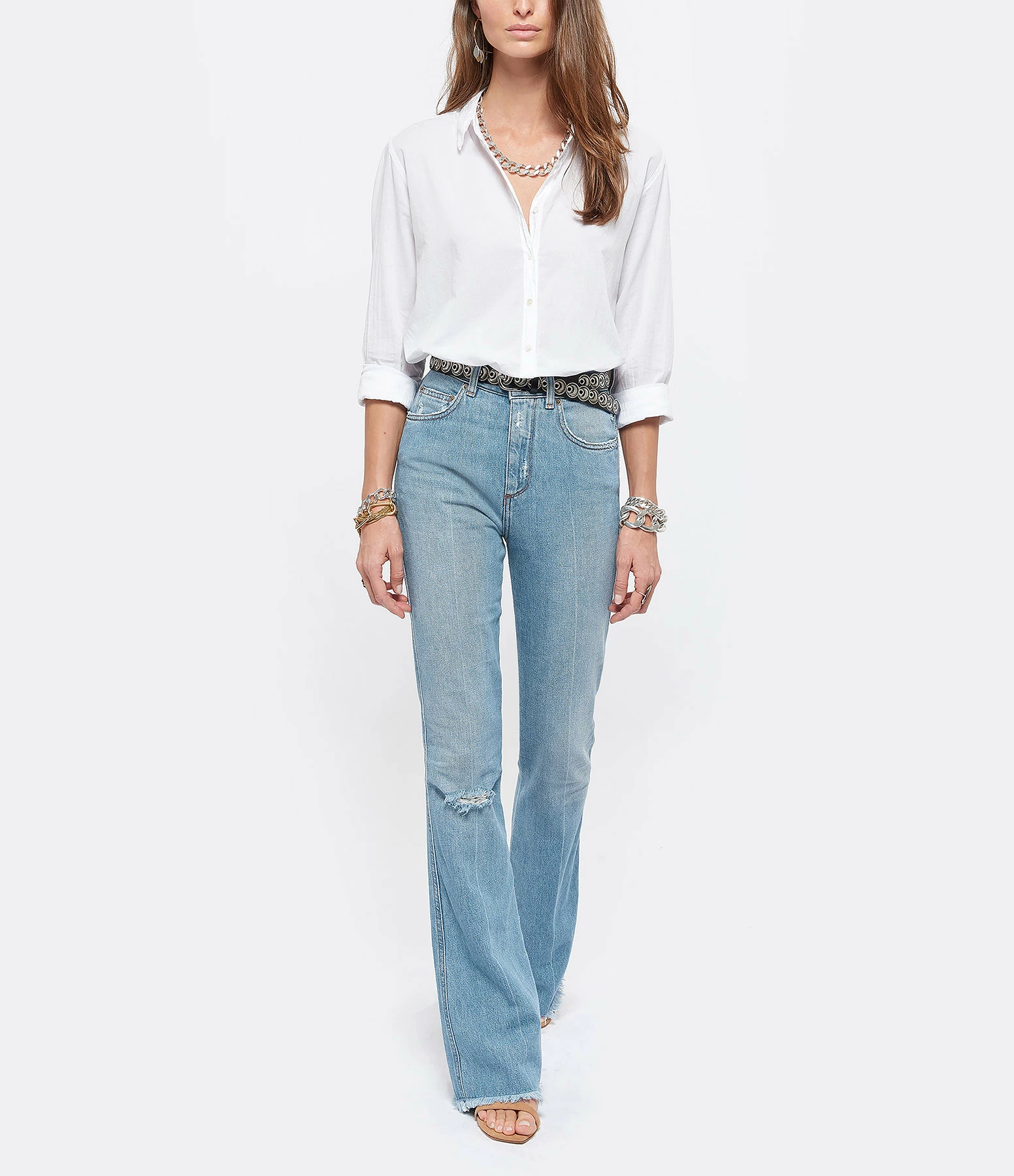 Chemise en coton blanc. Col chemisier. Manches longues. Fermeture boutonnée. Coupe droite. Base arrondie.