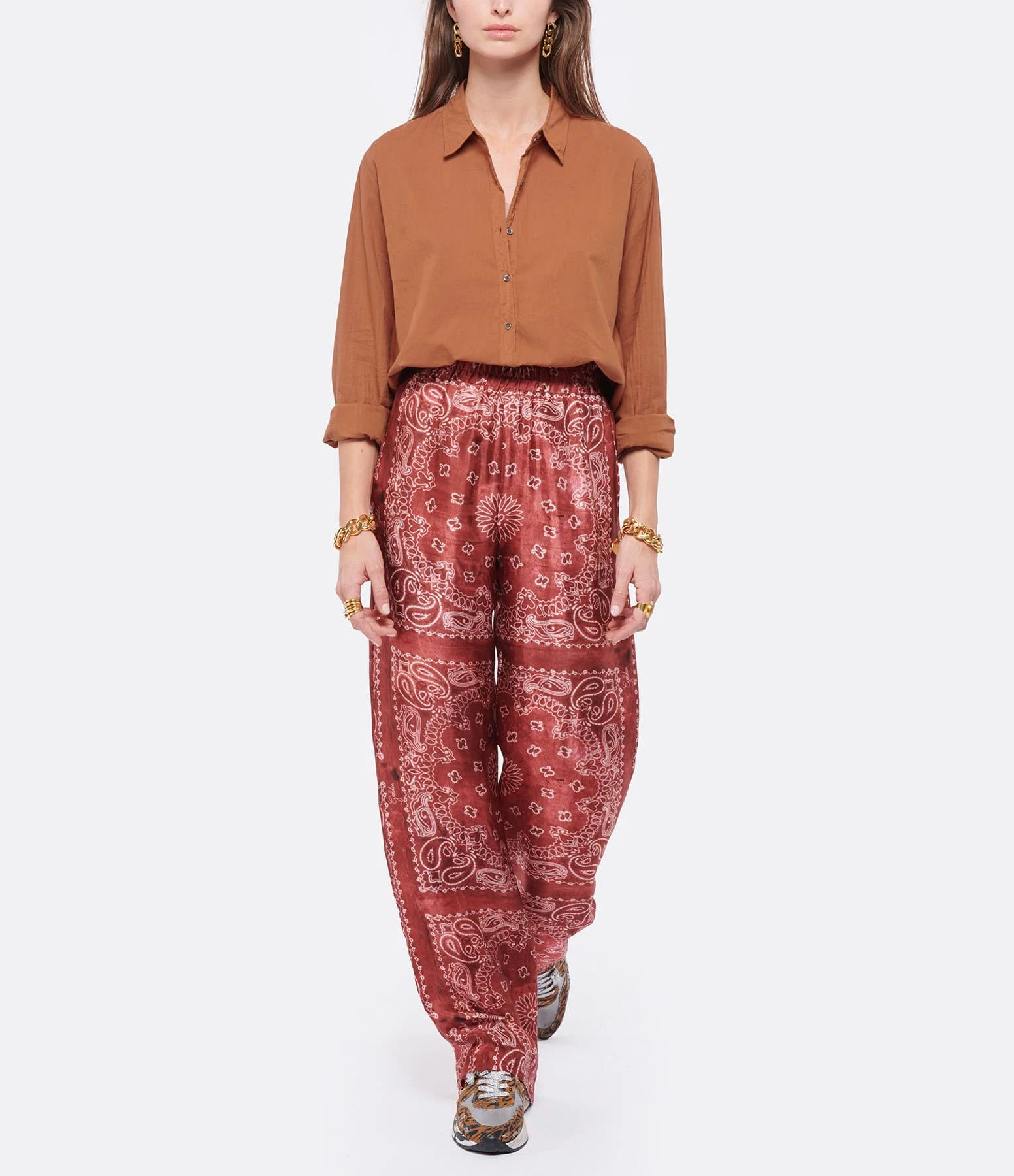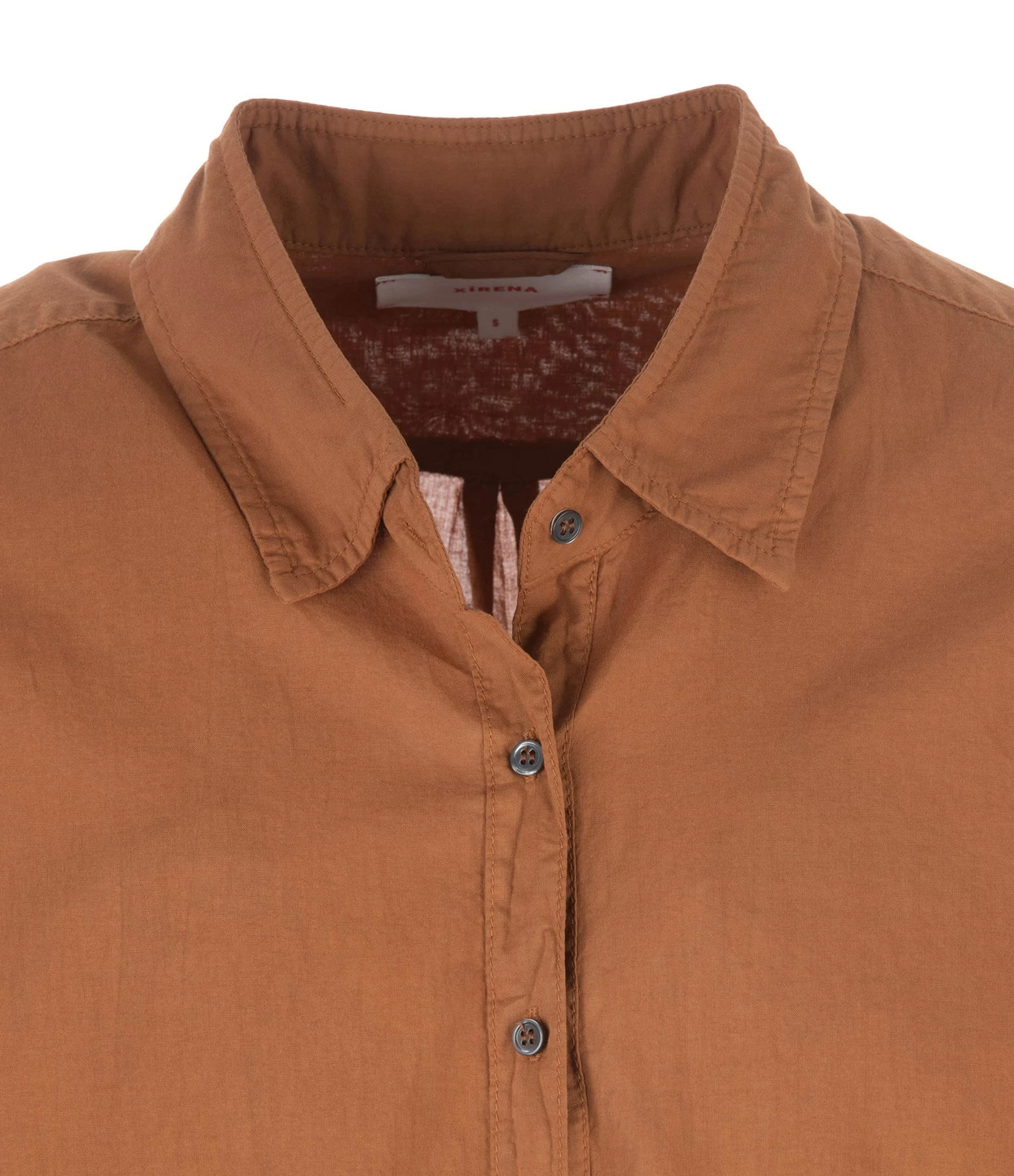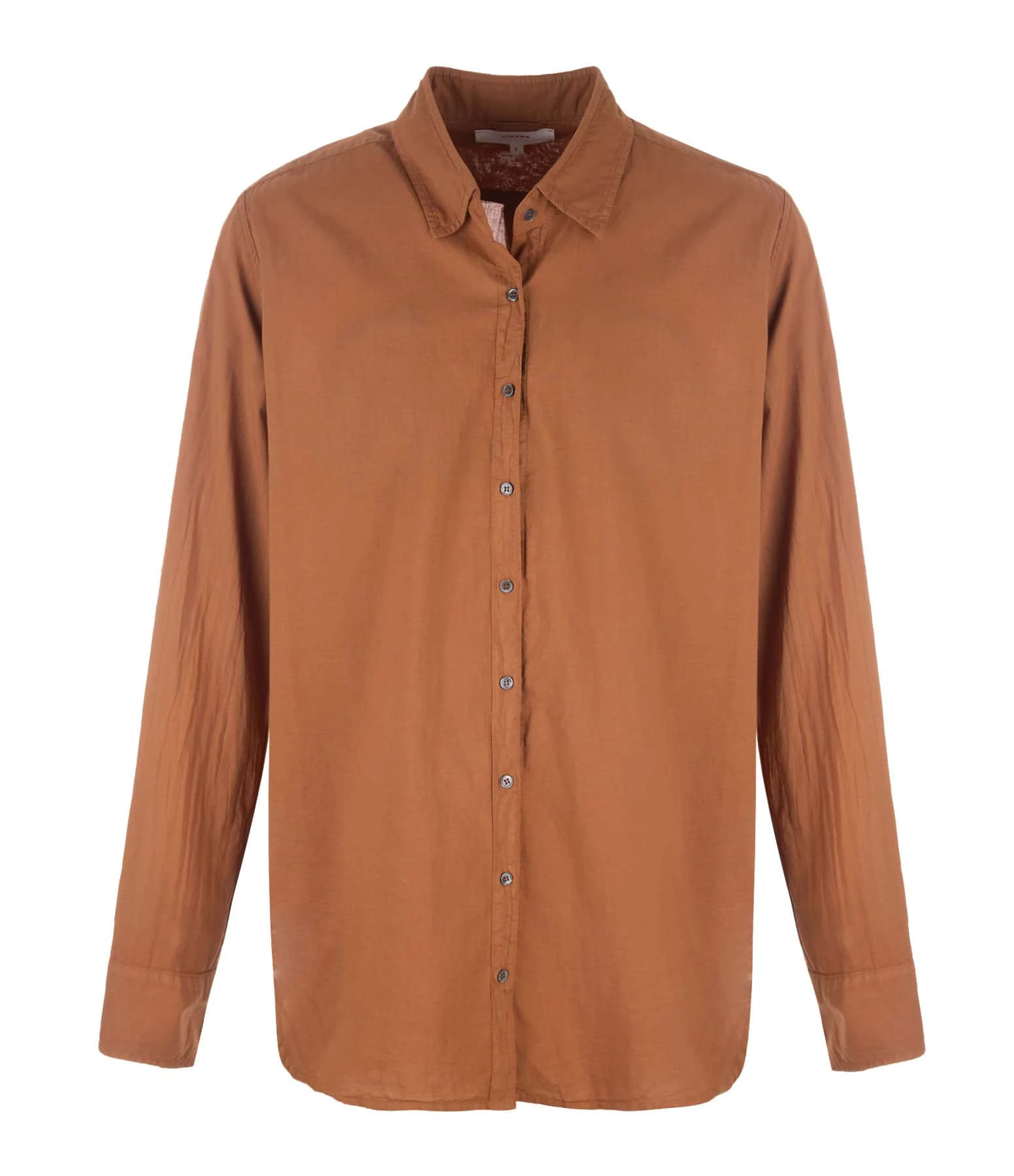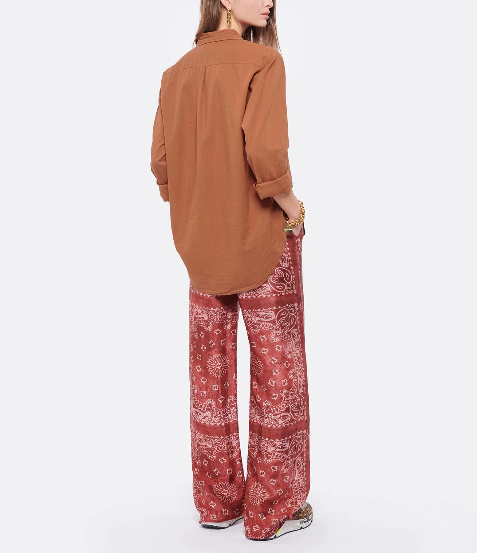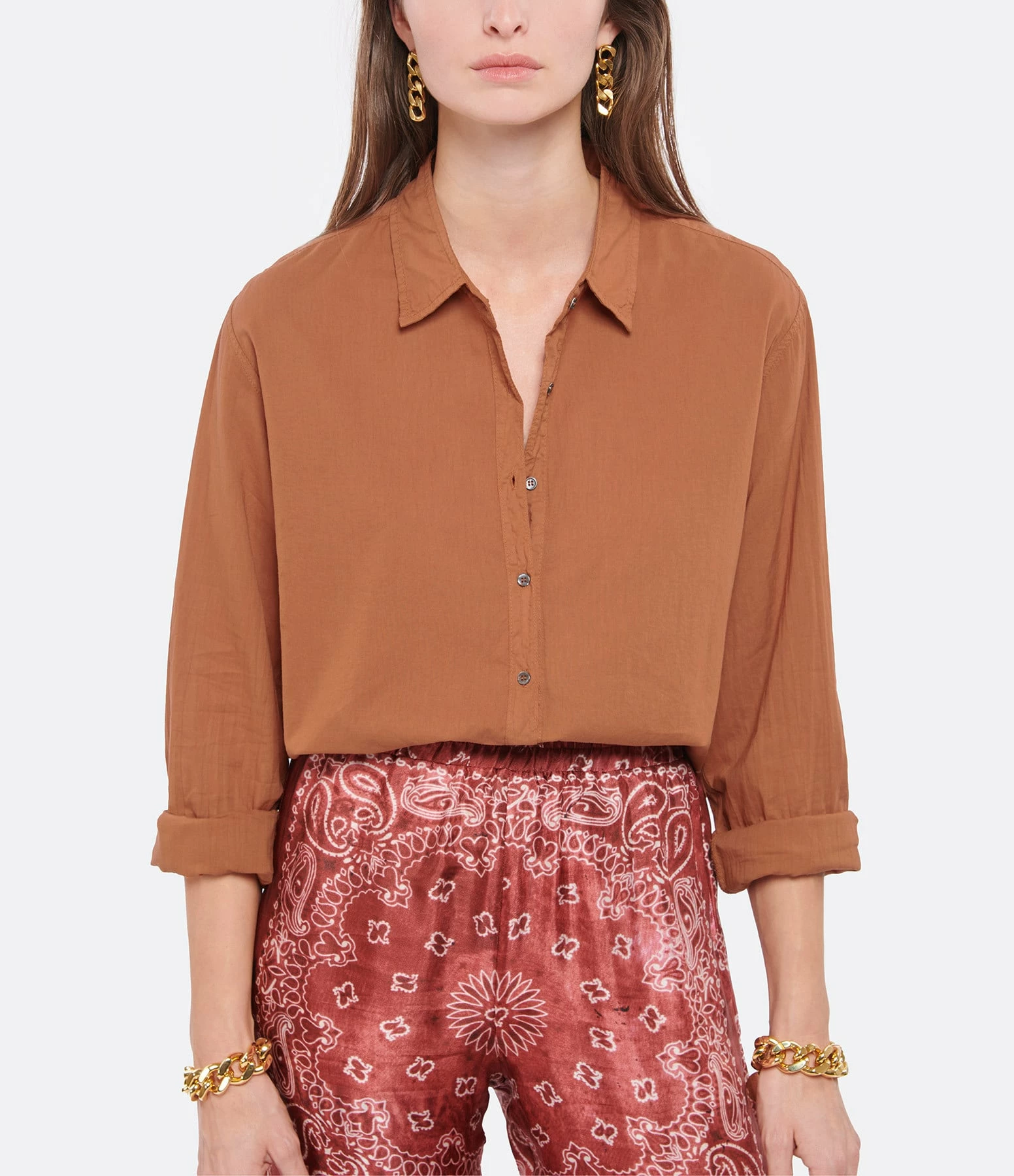 Chemise en coton rouille. Col chemisier. Manches longues. Fermeture boutonnée. Coupe droite. Base arrondie.