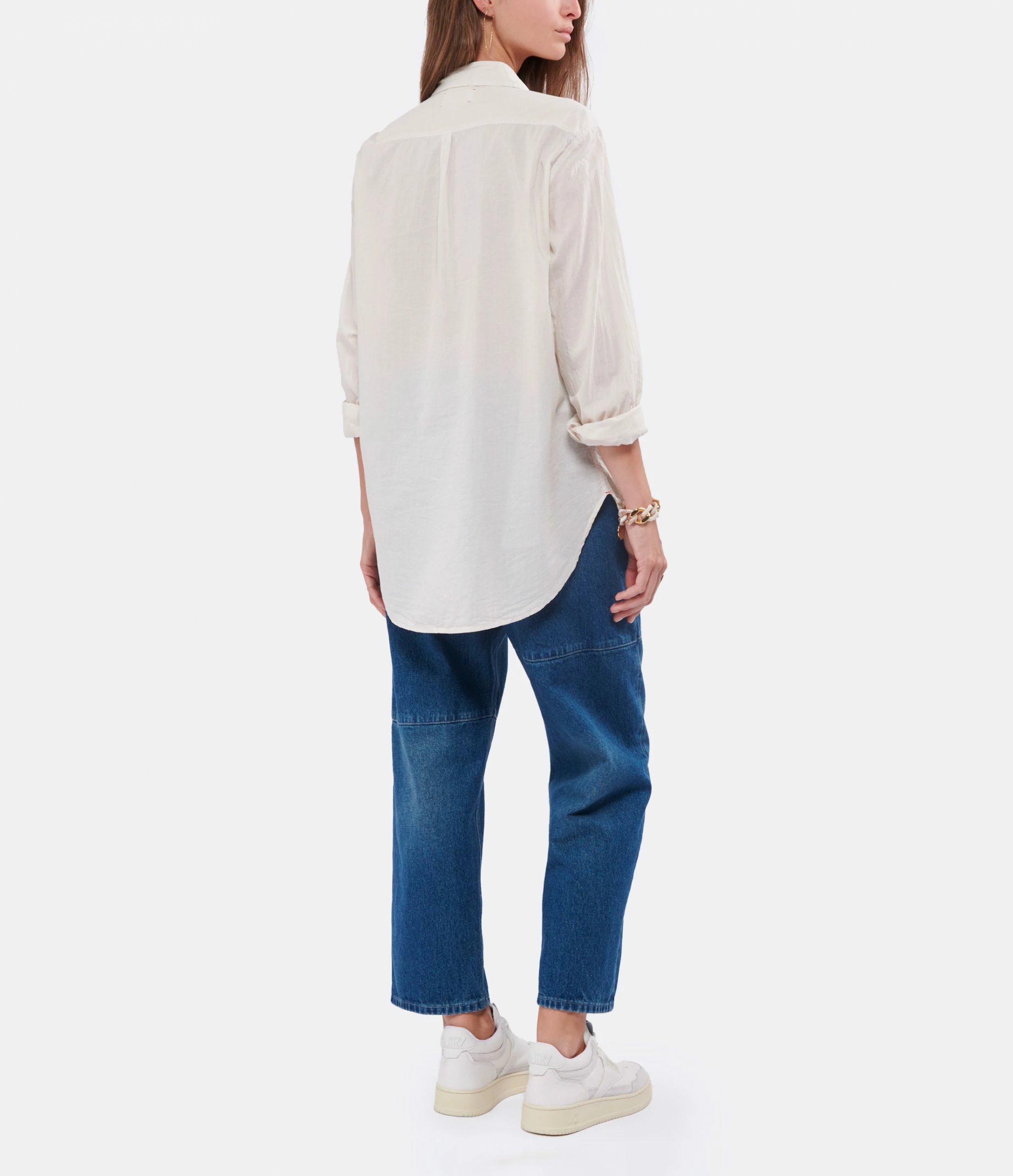 Chemise en coton beige clair. Col chemisier. Manches longues. Fermeture boutonnée. Coupe droite. Base arrondie.