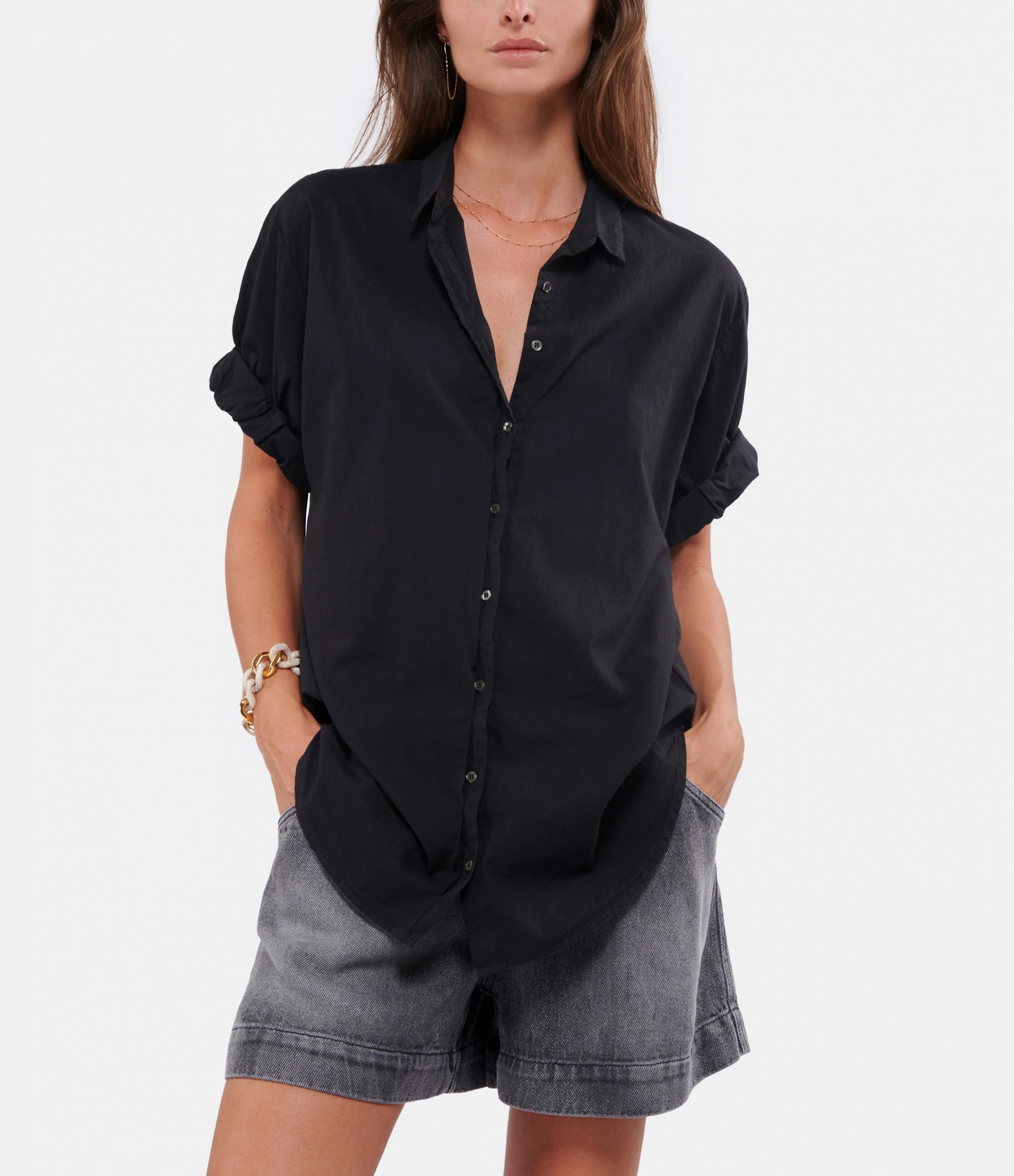 Chemise noire en coton. Col chemisier. Manches courtes retroussées. Fermeture par boutons. Coupe droite. Base arrondie.