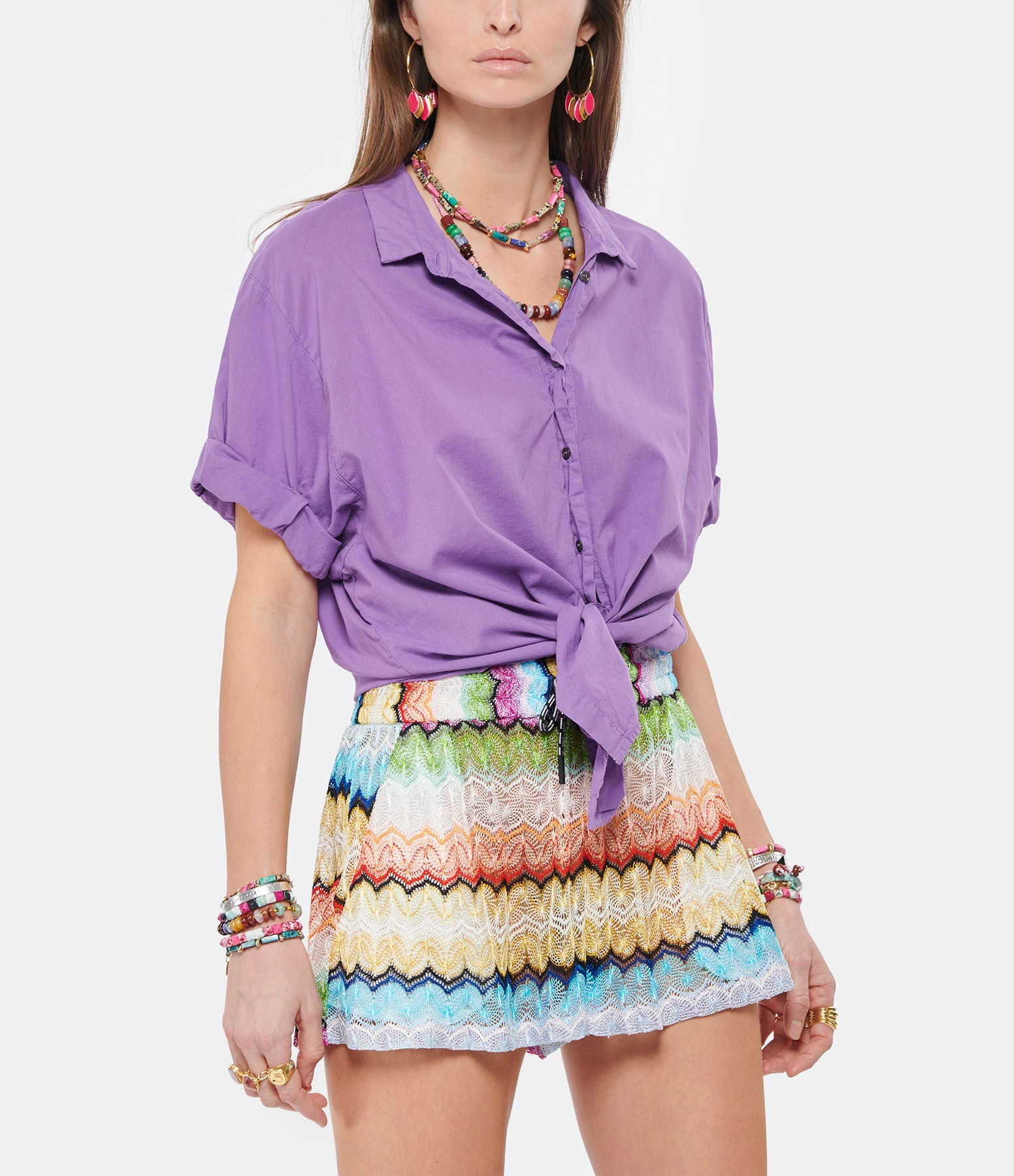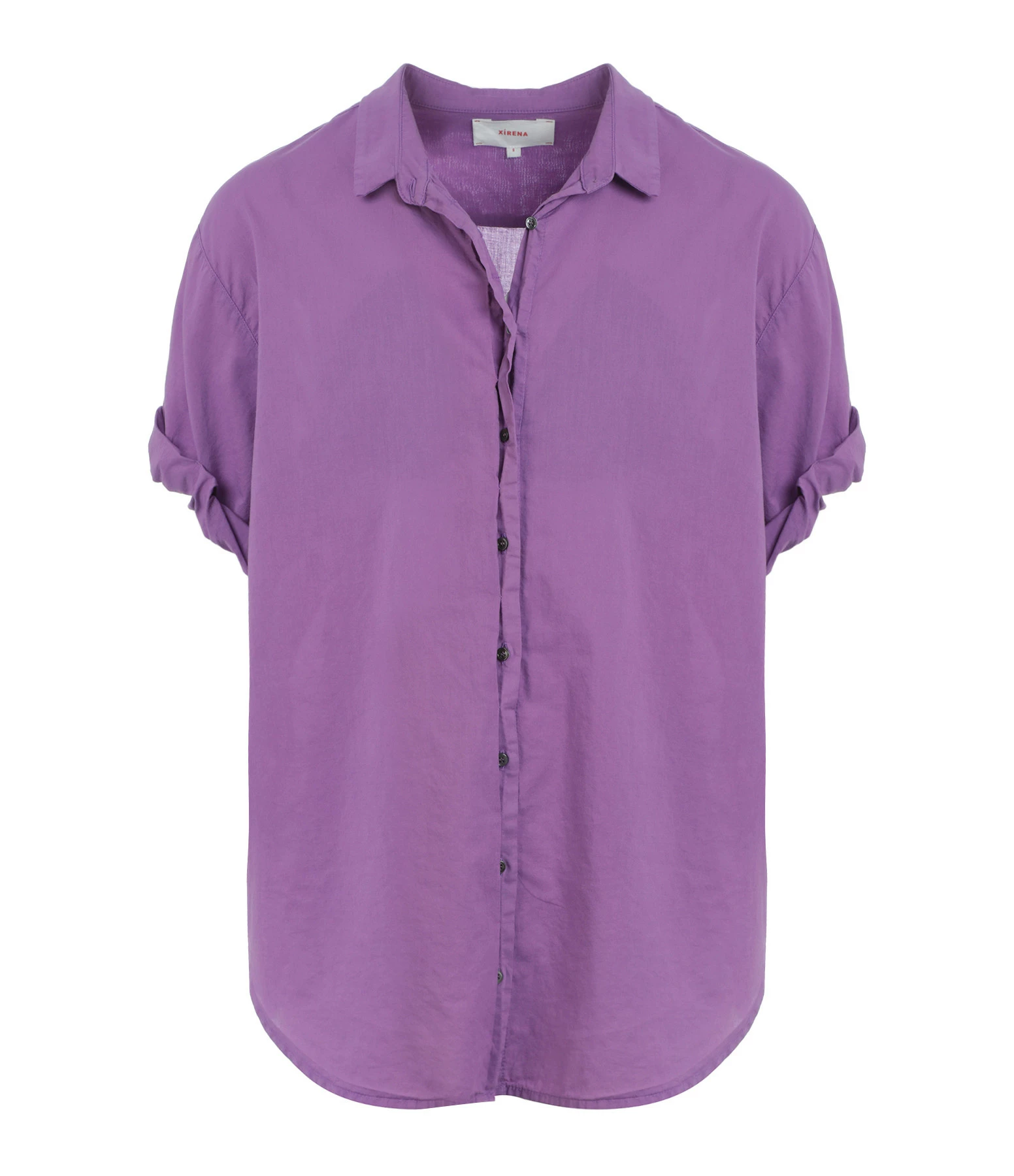 Chemise en coton violet. Col chemisier. Manches courtes retroussées. Fermeture par boutons. Coupe droite. Base arrondie.