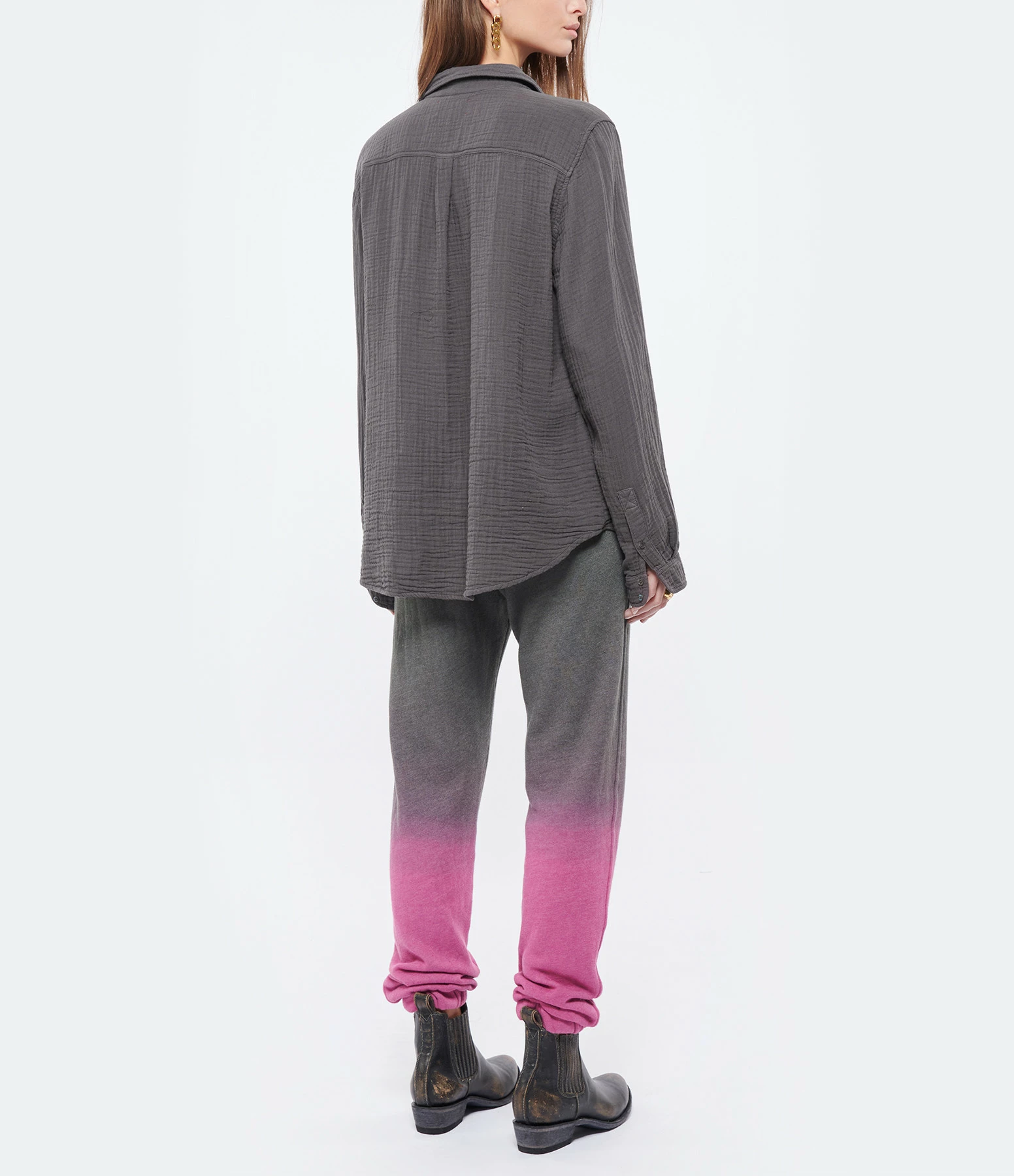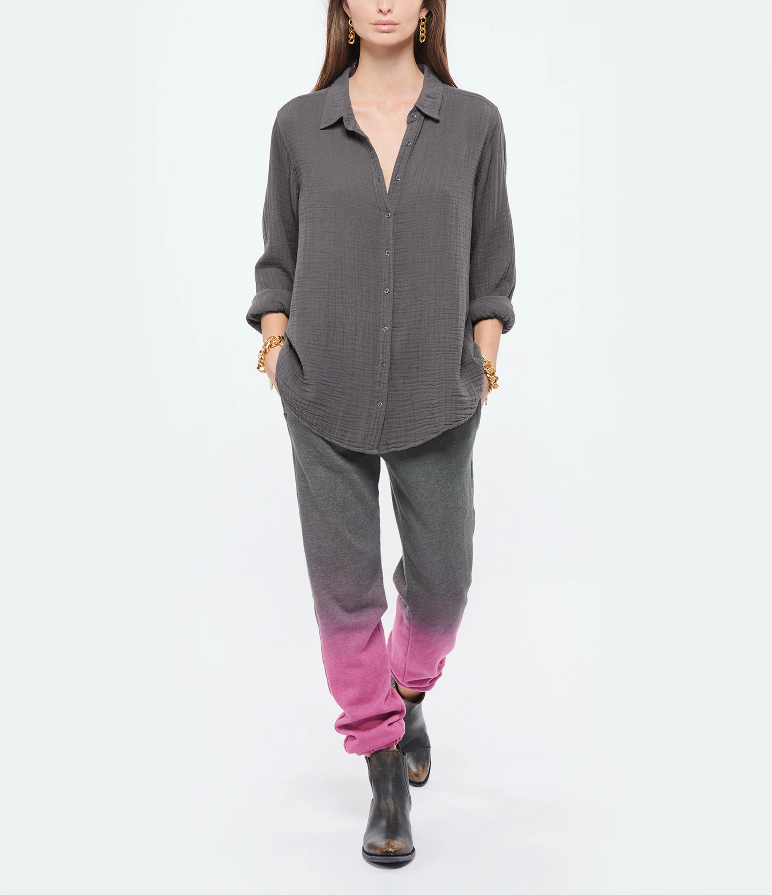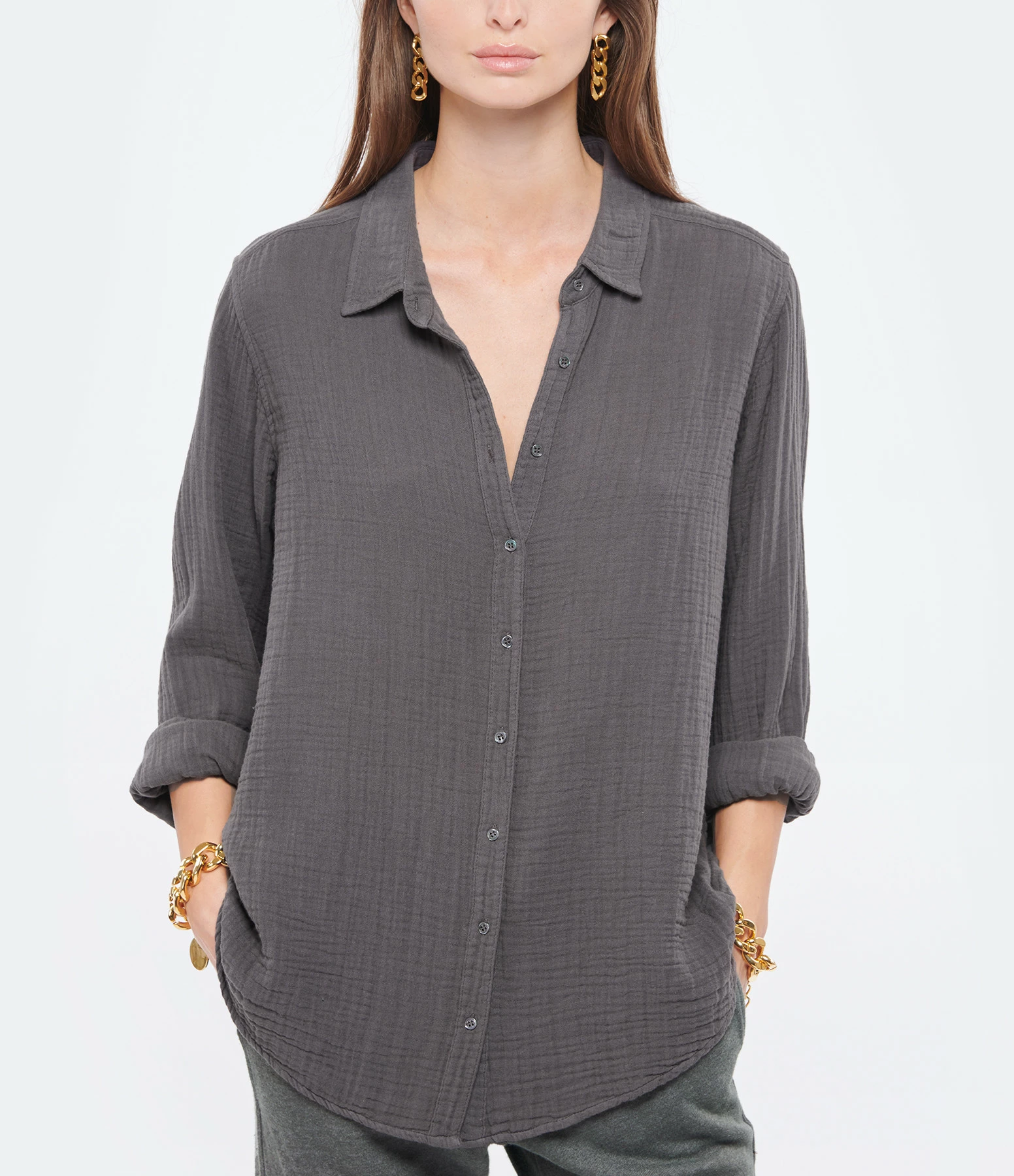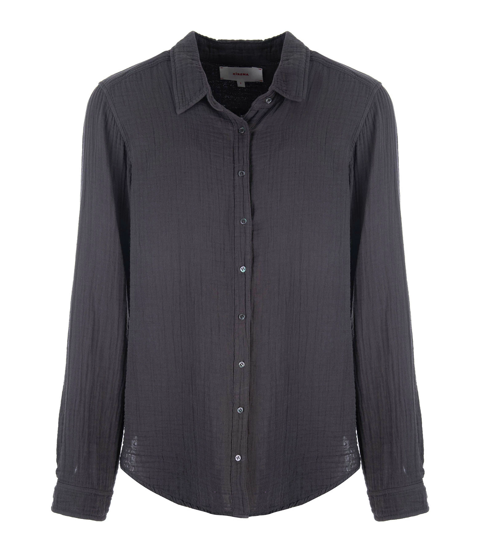 Chemise en gaze de coton gris anthracite. Col chemise. Manches longues. Fermeture boutonnée. Coupe droite. Base arrondie.