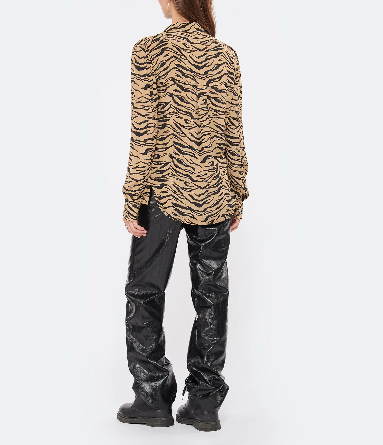 Chemise beige à imprimé tigré noir. Col chemisier. Manches longues. Fermeture boutonnée. Deux poches à rabat boutonnées sur le devant. Coupe droite. Base arrondie.