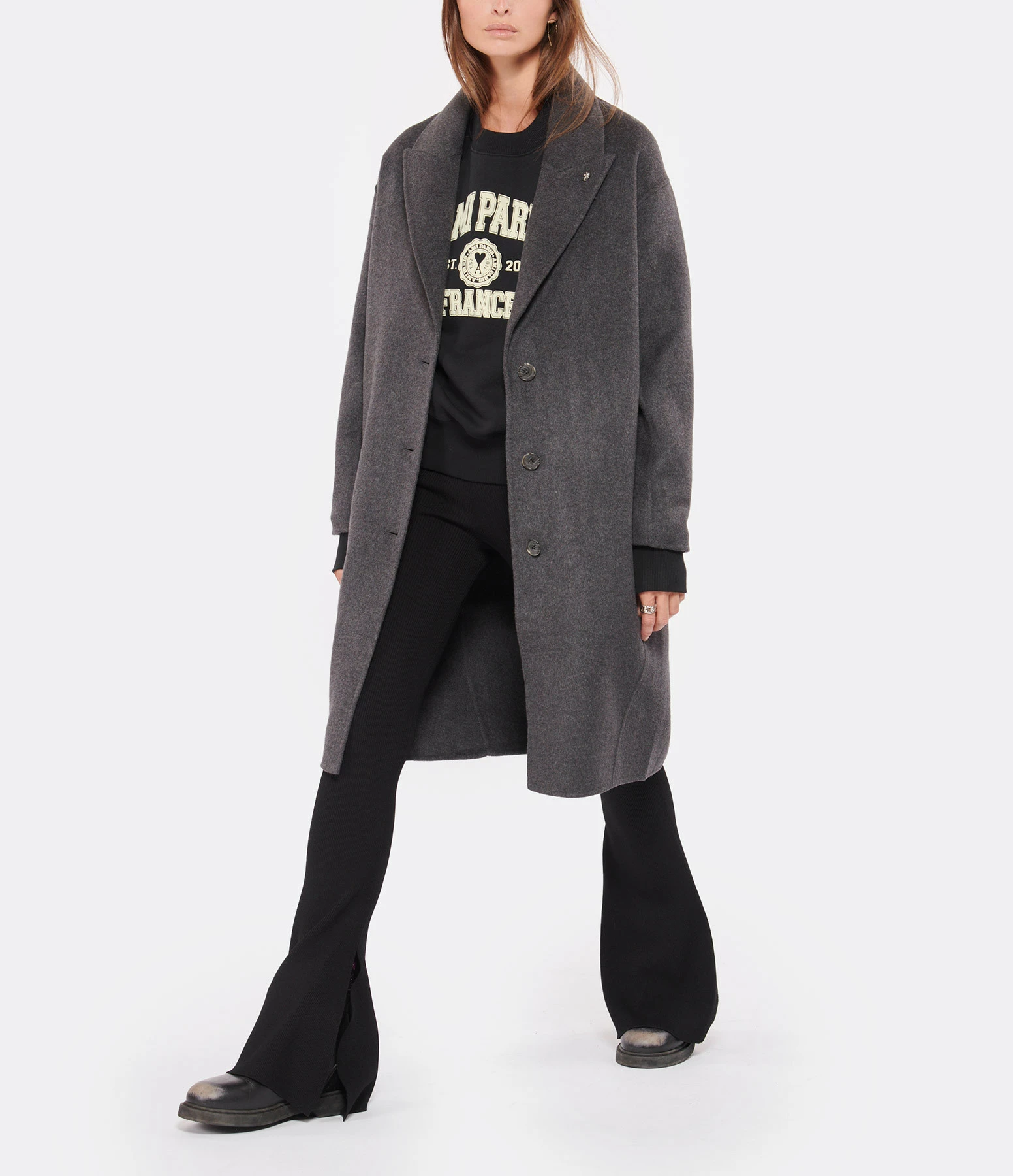Manteau mi-long en laine mélangée gris. Col tailleur cranté avec une une broche “tête de mort” pailletée. Manches longues tailleur. Fermeture boutonnée sur le devant. Boutons gris. Deux poches prises dans la couture sur le devant. Coupe droite. Base droite.